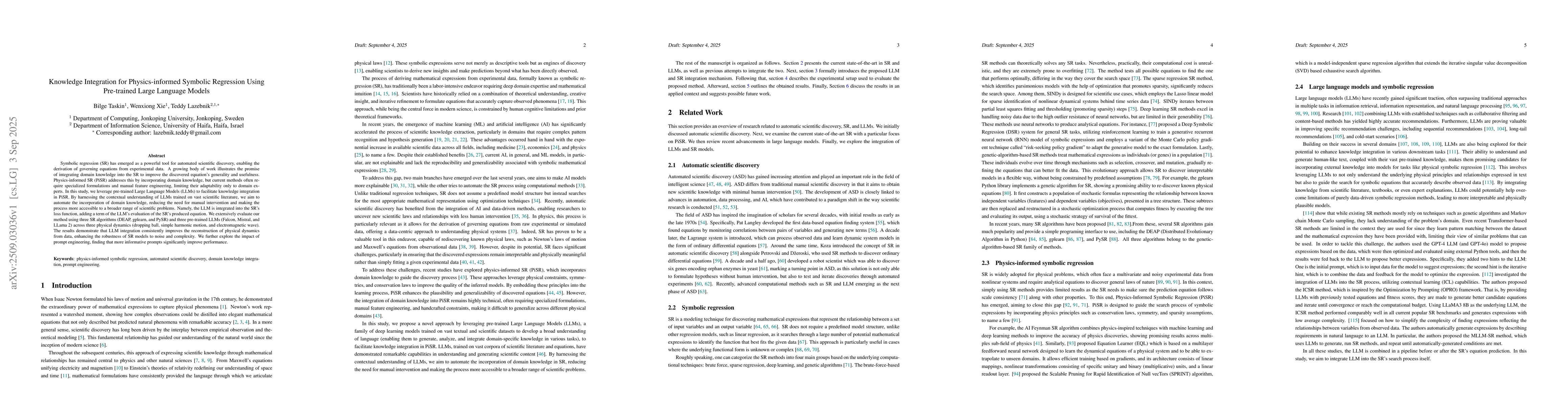 Symbolic regression (SR) has emerged as a powerful tool for automated scientific discovery, enabling the derivation of governing equations from experimental data. A growing body of work illustrates the promise of integrating domain knowledge into the SR to improve the discovered equation's generality and usefulness. Physics-informed SR (PiSR) addresses this by incorporating domain knowledge, but current methods often require specialized formulations and manual feature engineering, limiting their adaptability only to domain experts. In this study, we leverage pre-trained Large Language Models (LLMs) to facilitate knowledge integration in PiSR. By harnessing the contextual understanding of LLMs trained on vast scientific literature, we aim to automate the incorporation of domain knowledge, reducing the need for manual intervention and making the process more accessible to a broader range of scientific problems. Namely, the LLM is integrated into the SR's loss function, adding a term of the LLM's evaluation of the SR's produced equation. We extensively evaluate our method using three SR algorithms (DEAP, gplearn, and PySR) and three pre-trained LLMs (Falcon, Mistral, and LLama 2) across three physical dynamics (dropping ball, simple harmonic motion, and electromagnetic wave). The results demonstrate that LLM integration consistently improves the reconstruction of physical dynamics from data, enhancing the robustness of SR models to noise and complexity. We further explore the impact of prompt engineering, finding that more informative prompts significantly improve performance.