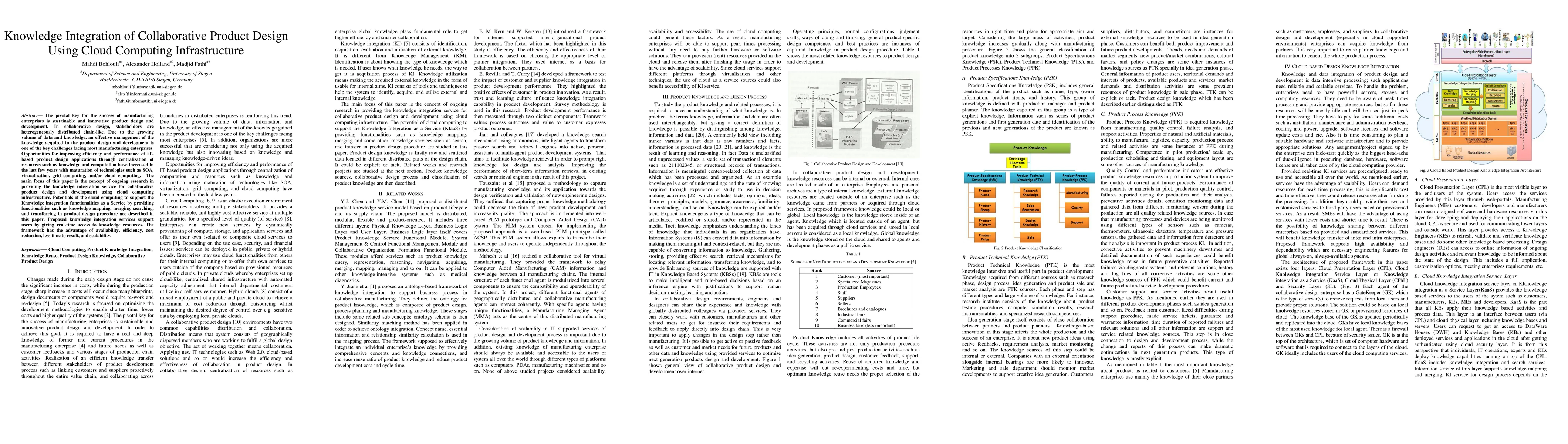 The pivotal key to the success of manufacturing enterprises is a sustainable and innovative product design and development. In collaborative design, stakeholders are heterogeneously distributed chain-like. Due to the growing volume of data and knowledge, effective management of the knowledge acquired in the product design and development is one of the key challenges facing most manufacturing enterprises. Opportunities for improving efficiency and performance of IT-based product design applications through centralization of resources such as knowledge and computation have increased in the last few years with the maturation of technologies such as SOA, virtualization, grid computing, and/or cloud computing. The main focus of this paper is the concept of ongoing research in providing the knowledge integration service for collaborative product design and development using cloud computing infrastructure. Potentials of the cloud computing to support the Knowledge integration functionalities as a Service by providing functionalities such as knowledge mapping, merging, searching, and transferring in product design procedure are described in this paper. Proposed knowledge integration services support users by giving real-time access to knowledge resources. The framework has the advantage of availability, efficiency, cost reduction, less time to result, and scalability.