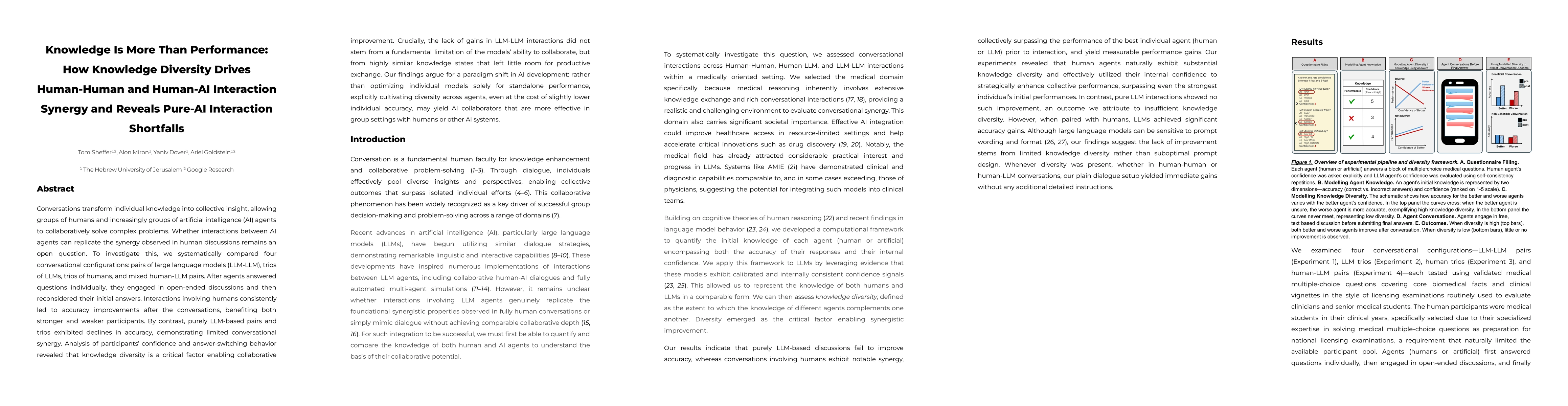 Conversations transform individual knowledge into collective insight, allowing groups of humans and increasingly groups of artificial intelligence (AI) agents to collaboratively solve complex problems. Whether interactions between AI agents can replicate the synergy observed in human discussions remains an open question. To investigate this, we systematically compared four conversational configurations: pairs of large language models (LLM-LLM), trios of LLMs, trios of humans, and mixed human-LLM pairs. After agents answered questions individually, they engaged in open-ended discussions and then reconsidered their initial answers. Interactions involving humans consistently led to accuracy improvements after the conversations, benefiting both stronger and weaker participants. By contrast, purely LLM-based pairs and trios exhibited declines in accuracy, demonstrating limited conversational synergy. Analysis of participants' confidence and answer-switching behavior revealed that knowledge diversity is a critical factor enabling collaborative improvement. Crucially, the lack of gains in LLM-LLM interactions did not stem from a fundamental limitation of the models' ability to collaborate, but from highly similar knowledge states that left little room for productive exchange. Our findings argue for a paradigm shift in AI development: rather than optimizing individual models solely for standalone performance, explicitly cultivating diversity across agents, even at the cost of slightly lower individual accuracy, may yield AI collaborators that are more effective in group settings with humans or other AI systems.