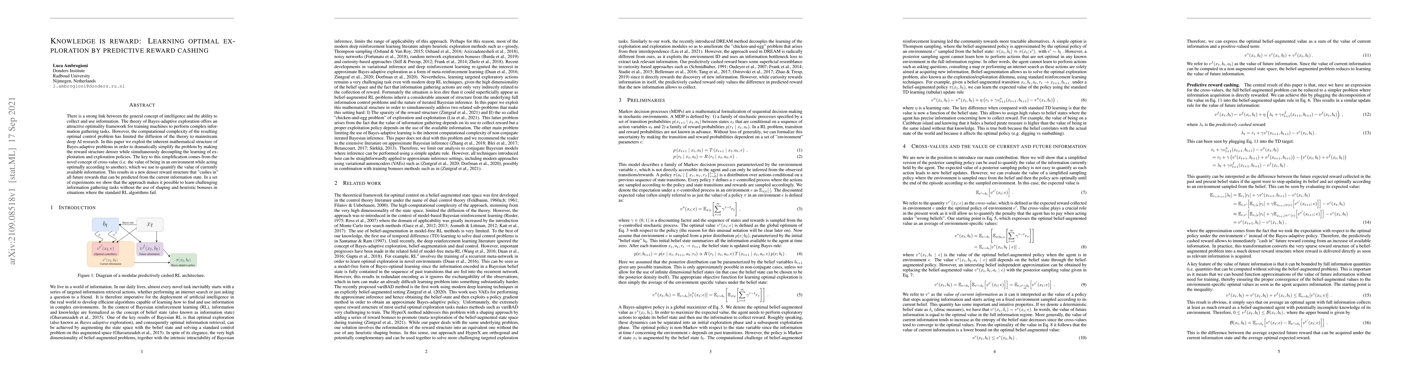 There is a strong link between the general concept of intelligence and the ability to collect and use information. The theory of Bayes-adaptive exploration offers an attractive optimality framework for training machines to perform complex information gathering tasks. However, the computational complexity of the resulting optimal control problem has limited the diffusion of the theory to mainstream deep AI research. In this paper we exploit the inherent mathematical structure of Bayes-adaptive problems in order to dramatically simplify the problem by making the reward structure denser while simultaneously decoupling the learning of exploitation and exploration policies. The key to this simplification comes from the novel concept of cross-value (i.e. the value of being in an environment while acting optimally according to another), which we use to quantify the value of currently available information. This results in a new denser reward structure that "cashes in" all future rewards that can be predicted from the current information state. In a set of experiments we show that the approach makes it possible to learn challenging information gathering tasks without the use of shaping and heuristic bonuses in situations where the standard RL algorithms fail.