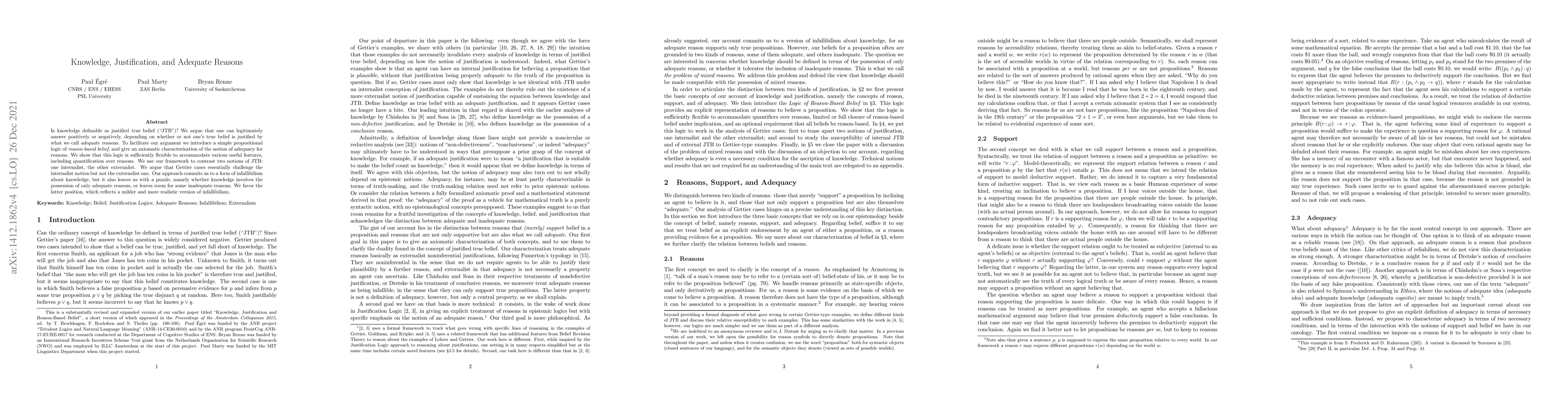 Is knowledge definable as justified true belief ("JTB")? We argue that one can legitimately answer positively or negatively, depending on whether or not one's true belief is justified by what we call adequate reasons. To facilitate our argument we introduce a simple propositional logic of reason-based belief, and give an axiomatic characterization of the notion of adequacy for reasons. We show that this logic is sufficiently flexible to accommodate various useful features, including quantification over reasons. We use our framework to contrast two notions of JTB: one internalist, the other externalist. We argue that Gettier cases essentially challenge the internalist notion but not the externalist one. Our approach commits us to a form of infallibilism about knowledge, but it also leaves us with a puzzle, namely whether knowledge involves the possession of only adequate reasons, or leaves room for some inadequate reasons. We favor the latter position, which reflects a milder and more realistic version of infallibilism.