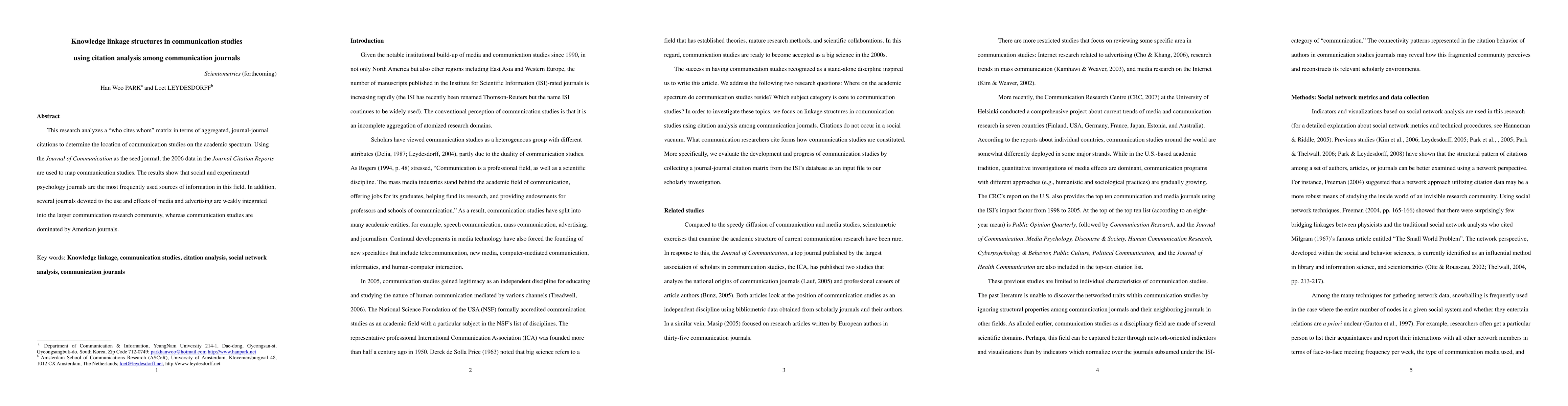 This research analyzes a "who cites whom" matrix in terms of aggregated, journal-journal citations to determine the location of communication studies on the academic spectrum. Using the Journal of Communication as the seed journal, the 2006 data in the Journal Citation Reports are used to map communication studies. The results show that social and experimental psychology journals are the most frequently used sources of information in this field. In addition, several journals devoted to the use and effects of media and advertising are weakly integrated into the larger communication research community, whereas communication studies are dominated by American journals.