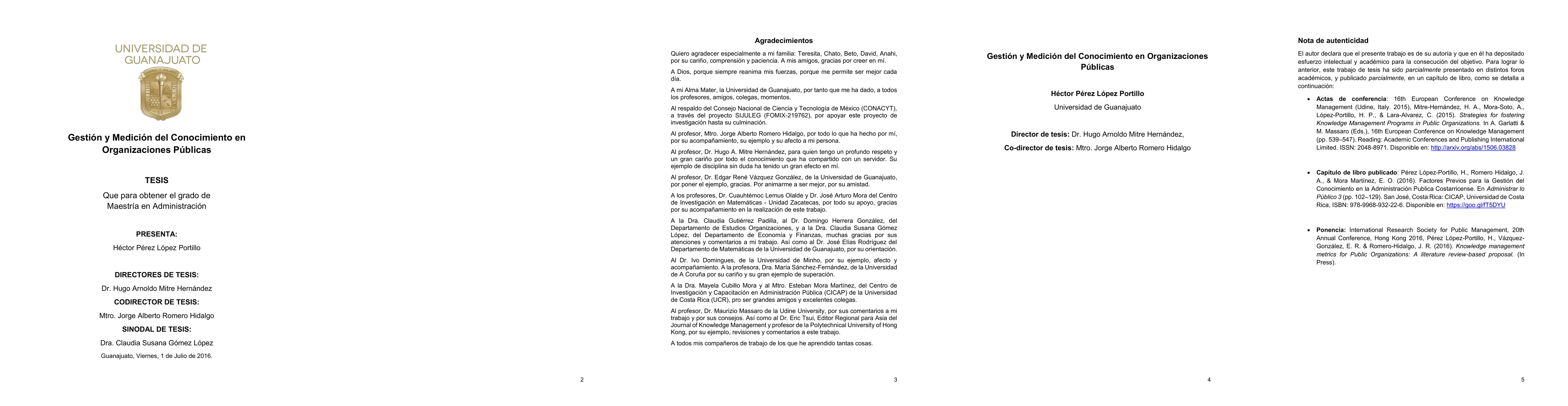 Knowledge Management (KM) is a strategic component that enables development, growth and continuous improvement of Public Sector Organizations (PSO). This thesis is bounded to this specific context. Indeed, we critically and comprehensively study the factors that characterize KM strategies and those that foster its development and success in PSO, then finally we propose metrics to measure and evaluate, in order to continuous and systematically improve KM practices in PSO. Main problems are related to the lack of academic literature that explains the elements that KM address in the given context. In addition, it is identified as a problem the lack of criteria for measuring and evaluating KM in PSO, from a different viewpoint than business perspective. The contribution of this thesis is that it provides valuable elements for an academic debate on the previous factors, strategies and metrics to promote KM initiatives in PSO. To achieve the research objective of this thesis we performed a comprehensive systematic literature review in order to discover what the KM critical success factors are, and also we integrated and proposed some metrics to evaluate and assess the performance of KM in PSO. We conducted an in-depth study among different Public Sector Organizations in order to learn what are the critical success factors that must be first considered before implement KM initiatives. based on this. Finally, based on this methodological proposal and as a result of this research, we were able to analyze and explain the critical success factors, we identified some strategies to encourage the success of KM and integrated a proposal of metrics, from different approaches, for KM in PSO.