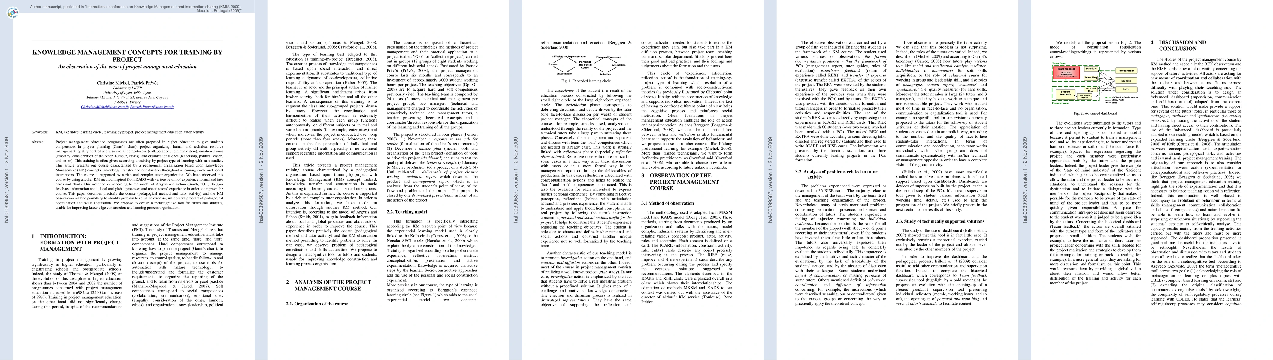 Project management education programmes are often proposed in higher education to give students competences in project planning (Gantt's chart), project organizing, human and technical resource management, quality control and also social competences (collaboration, communication), emotional ones (empathy, consideration of the other, humour, ethics), and organizational ones (leadership, political vision, and so on). This training is often given according a training-by-project type of learning with case studies. This article presents one course characterized by a pedagogical organization based upon Knowledge Management (KM) concepts: knowledge transfer and construction throughout a learning circle and social interactions. The course is supported by a rich and complex tutor organization. We have observed this course by using another KM method inspired from KADS with various return of experience formalized into cards and charts. Our intention is, according to the model of Argyris and Sch\"on (Smith, 2001), to gain feedback information about local and global processes and about actors' experience in order to improve the course. This paper describes precisely the course (pedagogical method and tutor activity) and the KM observation method permitting to identify problem to solve. In our case, we observe problem of pedacogical coordination and skills acquisition. We propose to design a metacognitive tool for tutors and students, usable for improving knowledge construction and learning process organisation
