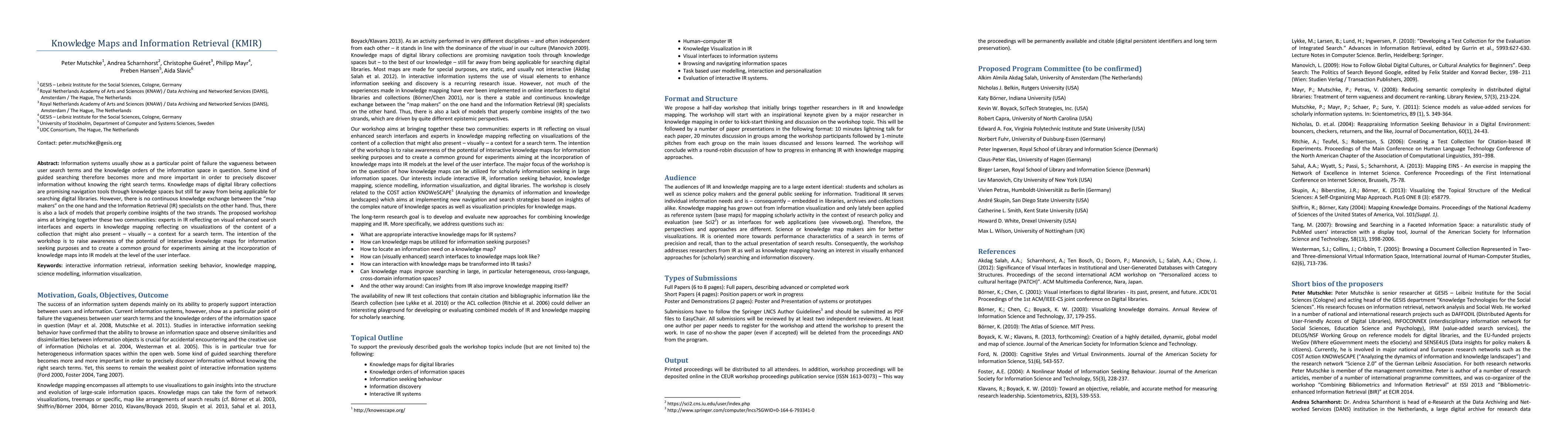 Information systems usually show as a particular point of failure the vagueness between user search terms and the knowledge orders of the information space in question. Some kind of guided searching therefore becomes more and more important in order to precisely discover information without knowing the right search terms. Knowledge maps of digital library collections are promising navigation tools through knowledge spaces but still far away from being applicable for searching digital libraries. However, there is no continuous knowledge exchange between the "map makers" on the one hand and the Information Retrieval (IR) specialists on the other hand. Thus, there is also a lack of models that properly combine insights of the two strands. The proposed workshop aims at bringing together these two communities: experts in IR reflecting on visual enhanced search interfaces and experts in knowledge mapping reflecting on visualizations of the content of a collection that might also present a context for a search term in a visual manner. The intention of the workshop is to raise awareness of the potential of interactive knowledge maps for information seeking purposes and to create a common ground for experiments aiming at the incorporation of knowledge maps into IR models at the level of the user interface.