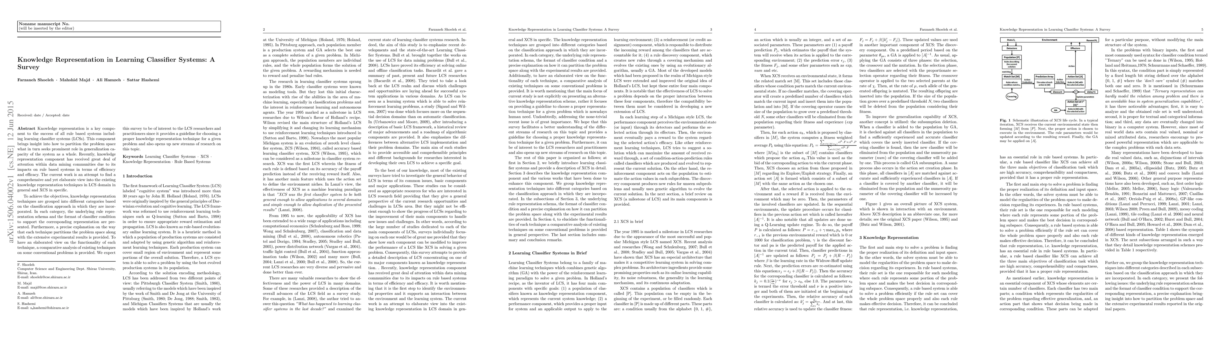 This paper reviews knowledge representation techniques in learning classifier systems (LCSs), particularly focusing on XCS. It categorizes these techniques, analyzes their impact on problem space partitioning and generalization, and provides comparative analyses and experimental results to guide LCS researchers in selecting appropriate methods.