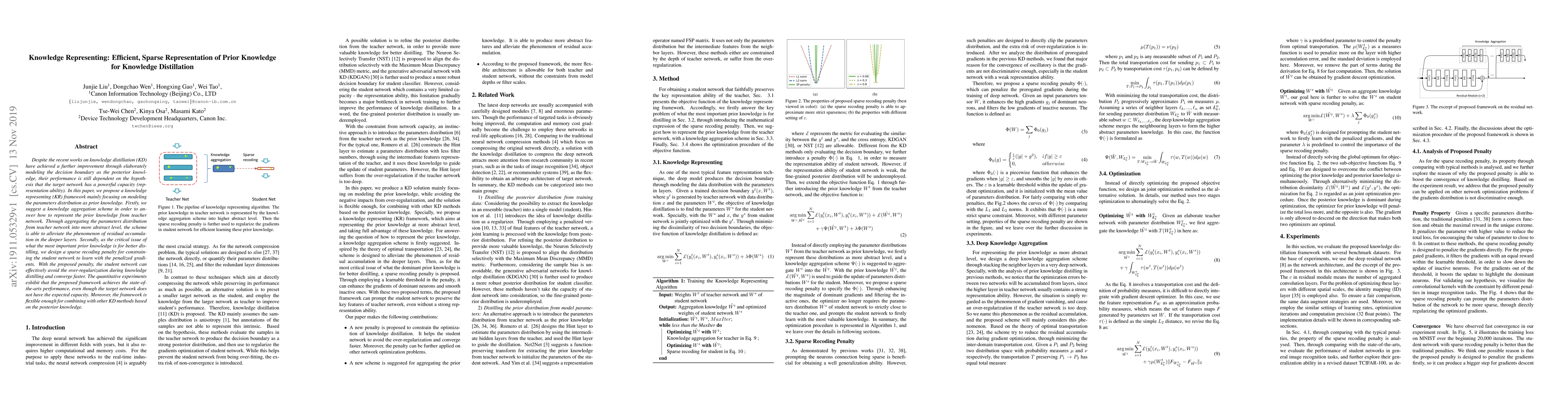 This paper proposes a knowledge representing (KR) framework for knowledge distillation that focuses on modeling the parameters distribution as prior knowledge. It introduces a knowledge aggregation scheme to alleviate residual accumulation and a sparse recoding penalty to avoid over-regularization, achieving state-of-the-art performance even with less capable target networks.