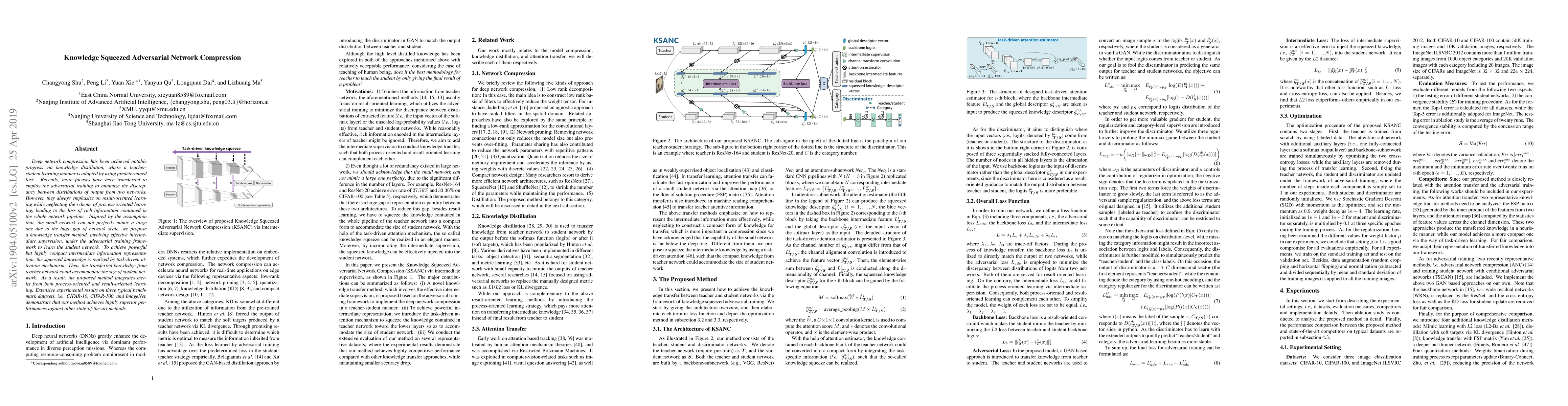 The paper proposes a novel knowledge transfer method using adversarial training and intermediate supervision to compress deep networks while preserving rich information. The method employs a task-driven attention mechanism to achieve powerful yet compact representations, integrating both process-oriented and result-oriented learning, and outperforms other state-of-the-art compression methods on CIFAR-10, CIFAR-100, and ImageNet datasets.