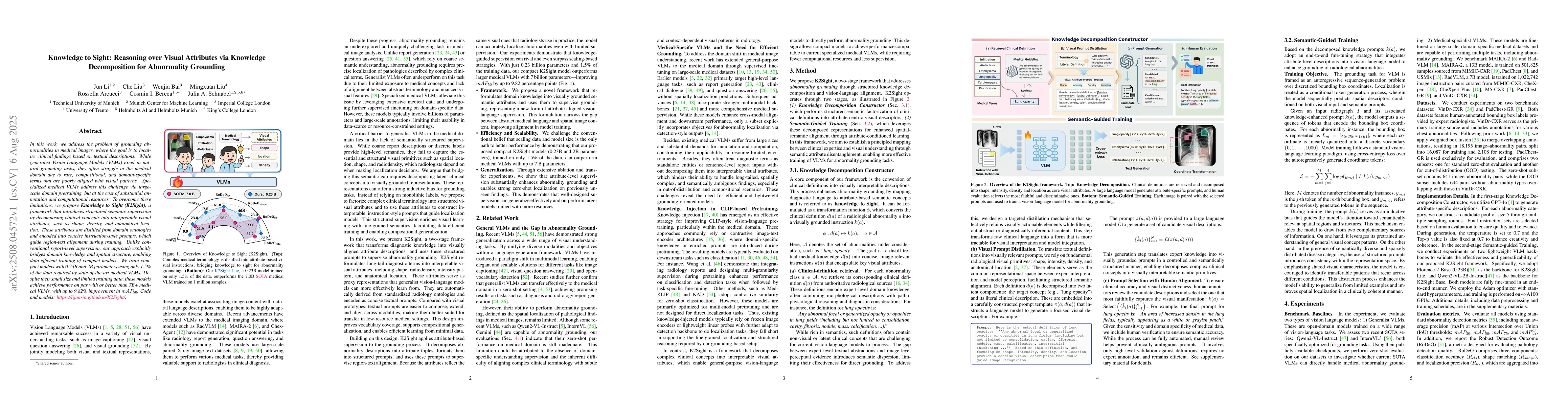 In this work, we address the problem of grounding abnormalities in medical images, where the goal is to localize clinical findings based on textual descriptions. While generalist Vision-Language Models (VLMs) excel in natural grounding tasks, they often struggle in the medical domain due to rare, compositional, and domain-specific terms that are poorly aligned with visual patterns. Specialized medical VLMs address this challenge via large-scale domain pretraining, but at the cost of substantial annotation and computational resources. To overcome these limitations, we propose \textbf{Knowledge to Sight (K2Sight)}, a framework that introduces structured semantic supervision by decomposing clinical concepts into interpretable visual attributes, such as shape, density, and anatomical location. These attributes are distilled from domain ontologies and encoded into concise instruction-style prompts, which guide region-text alignment during training. Unlike conventional report-level supervision, our approach explicitly bridges domain knowledge and spatial structure, enabling data-efficient training of compact models. We train compact models with 0.23B and 2B parameters using only 1.5\% of the data required by state-of-the-art medical VLMs. Despite their small size and limited training data, these models achieve performance on par with or better than 7B+ medical VLMs, with up to 9.82\% improvement in $mAP_{50}$. Code and models: \href{https://lijunrio.github.io/K2Sight/}{\textcolor{SOTAPink}{https://lijunrio.github.io/K2Sight/}}.