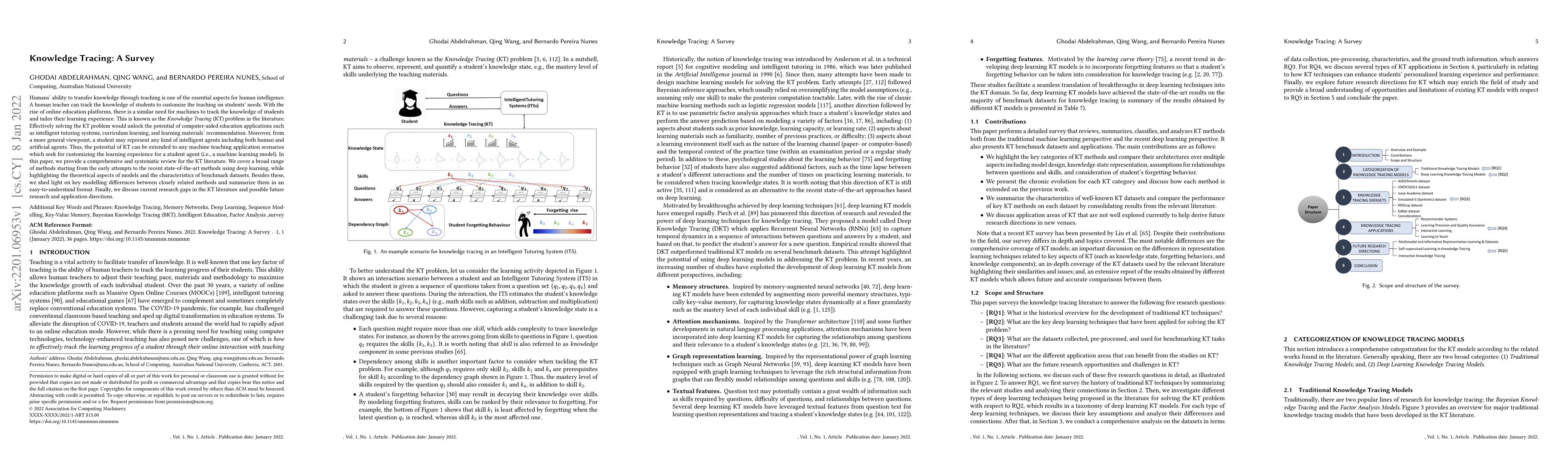This paper provides a comprehensive survey of Knowledge Tracing (KT) methods, reviewing both traditional and recent deep learning approaches to track and customize learning experiences for students in online education platforms. It highlights theoretical aspects, benchmark datasets, and identifies current research gaps and future directions.