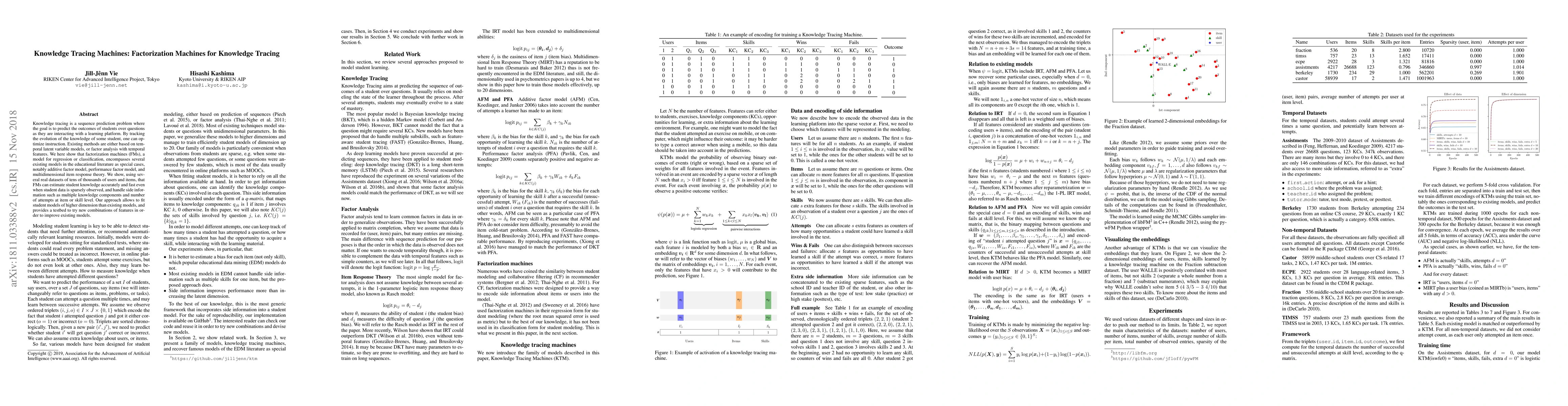 Knowledge tracing is a sequence prediction problem where the goal is to predict the outcomes of students over questions as they are interacting with a learning platform. By tracking the evolution of the knowledge of some student, one can optimize instruction. Existing methods are either based on temporal latent variable models, or factor analysis with temporal features. We here show that factorization machines (FMs), a model for regression or classification, encompasses several existing models in the educational literature as special cases, notably additive factor model, performance factor model, and multidimensional item response theory. We show, using several real datasets of tens of thousands of users and items, that FMs can estimate student knowledge accurately and fast even when student data is sparsely observed, and handle side information such as multiple knowledge components and number of attempts at item or skill level. Our approach allows to fit student models of higher dimension than existing models, and provides a testbed to try new combinations of features in order to improve existing models.