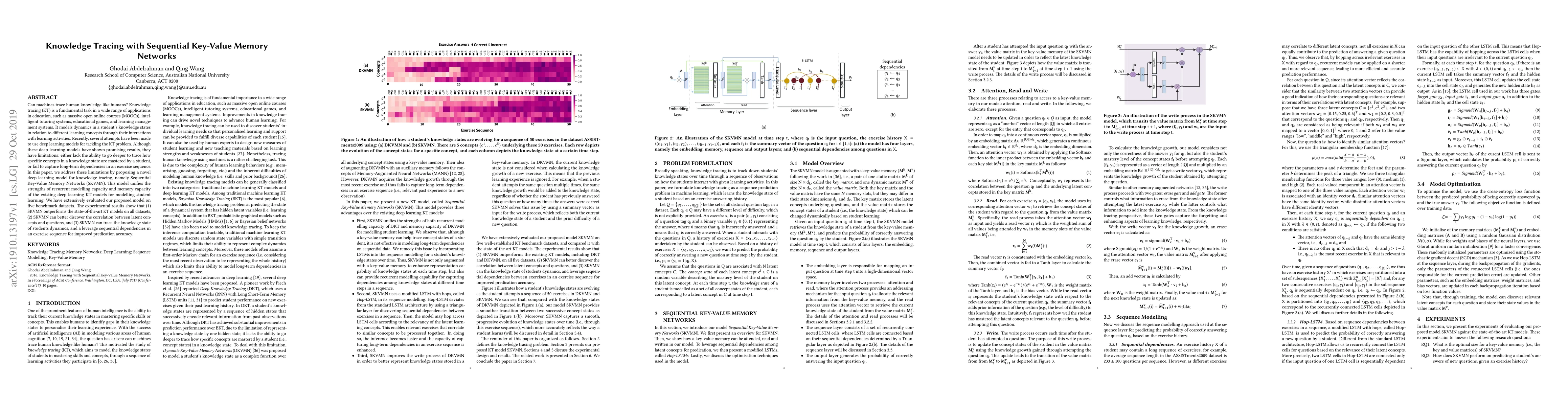 This paper proposes Sequential Key-Value Memory Networks (SKVMN) to improve knowledge tracing in educational applications, outperforming existing models by better capturing long-term dependencies and specific concept mastery. Experimental results show SKVMN's superior performance and ability to trace student knowledge dynamics.