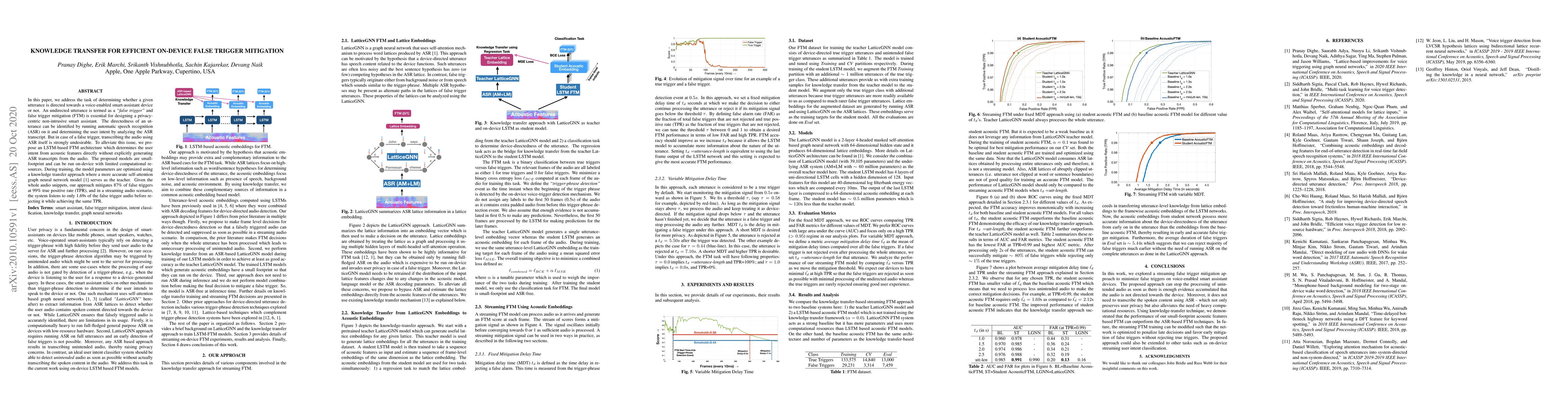 The paper introduces a novel knowledge transfer method for on-device false trigger mitigation using LSTM-based acoustic embeddings, bypassing ASR transcription.