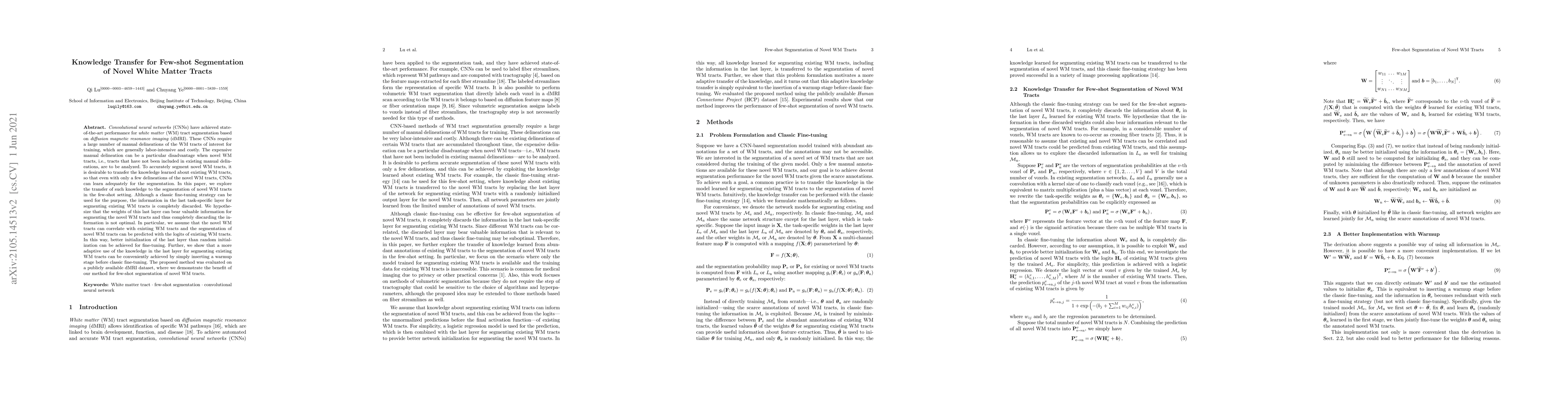 This paper explores knowledge transfer techniques to enable the few-shot segmentation of novel white matter tracts using convolutional neural networks, addressing the challenge of limited manual delineations. It proposes a method that leverages the weights from the last layer of a pre-trained network to better initialize fine-tuning, enhancing segmentation performance for novel tracts.