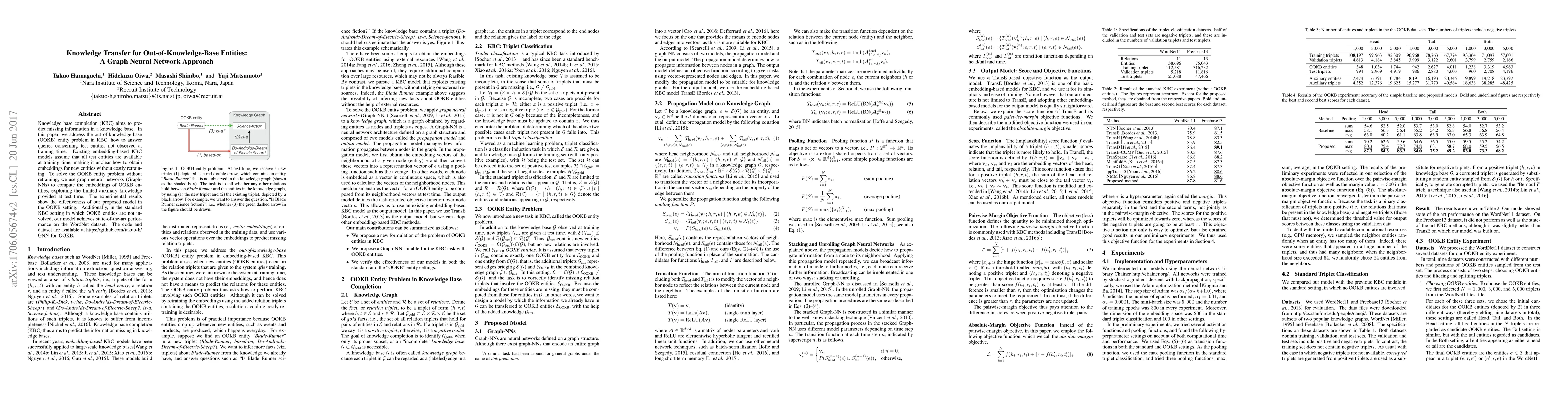 Knowledge base completion (KBC) aims to predict missing information in a knowledge base.In this paper, we address the out-of-knowledge-base (OOKB) entity problem in KBC:how to answer queries concerning test entities not observed at training time. Existing embedding-based KBC models assume that all test entities are available at training time, making it unclear how to obtain embeddings for new entities without costly retraining. To solve the OOKB entity problem without retraining, we use graph neural networks (Graph-NNs) to compute the embeddings of OOKB entities, exploiting the limited auxiliary knowledge provided at test time.The experimental results show the effectiveness of our proposed model in the OOKB setting.Additionally, in the standard KBC setting in which OOKB entities are not involved, our model achieves state-of-the-art performance on the WordNet dataset. The code and dataset are available at https://github.com/takuo-h/GNN-for-OOKB