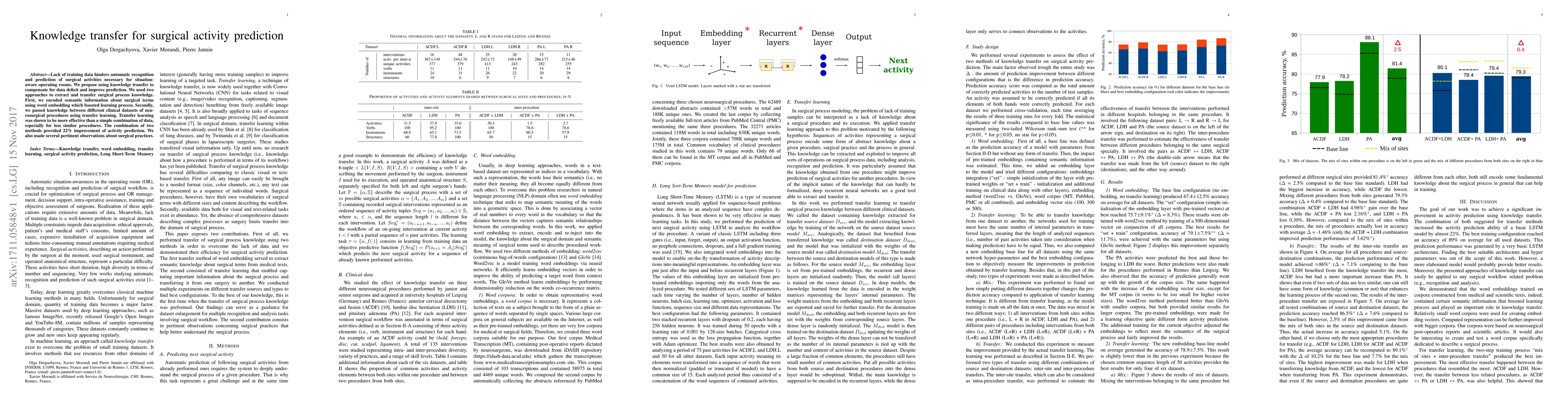 Lack of training data hinders automatic recognition and prediction of surgical activities necessary for situation-aware operating rooms. We propose using knowledge transfer to compensate for data deficit and improve prediction. We used two approaches to extract and transfer surgical process knowledge. First, we encoded semantic information about surgical terms using word embedding which boosted learning process. Secondly, we passed knowledge between different clinical datasets of neurosurgical procedures using transfer learning. Transfer learning was shown to be more effective than a simple combination of data, especially for less similar procedures. The combination of two methods provided 22% improvement of activity prediction. We also made several pertinent observations about surgical practices.