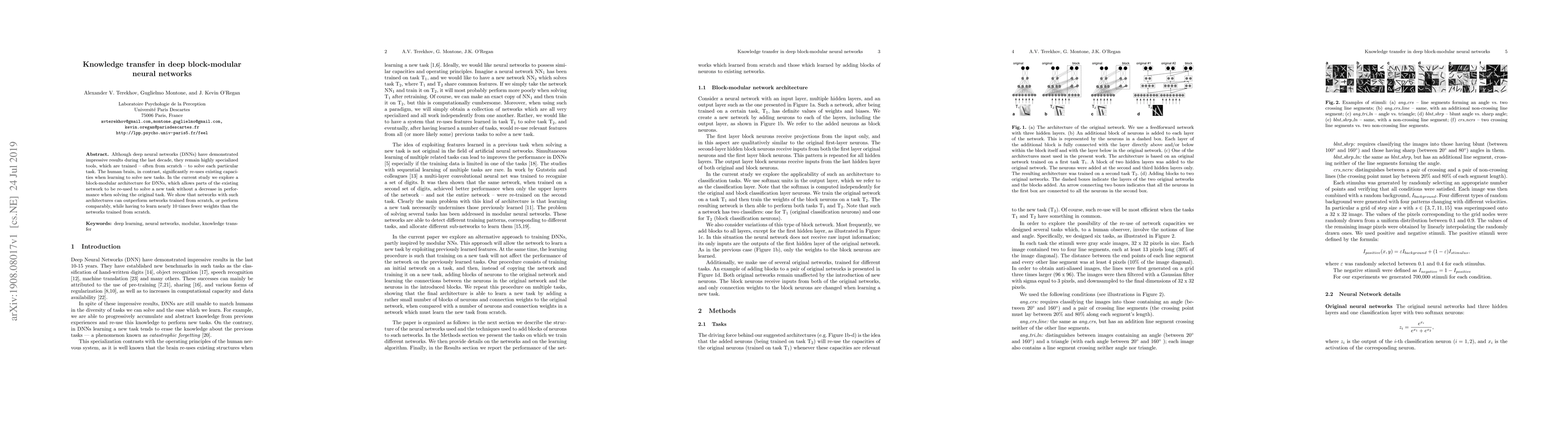 Although deep neural networks (DNNs) have demonstrated impressive results during the last decade, they remain highly specialized tools, which are trained -- often from scratch -- to solve each particular task. The human brain, in contrast, significantly re-uses existing capacities when learning to solve new tasks. In the current study we explore a block-modular architecture for DNNs, which allows parts of the existing network to be re-used to solve a new task without a decrease in performance when solving the original task. We show that networks with such architectures can outperform networks trained from scratch, or perform comparably, while having to learn nearly 10 times fewer weights than the networks trained from scratch.