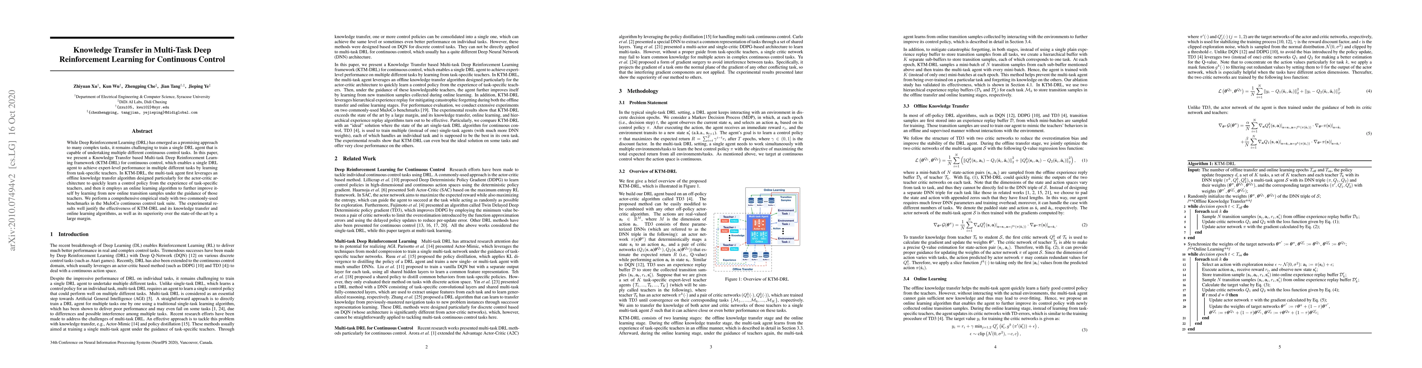 This paper introduces KTM-DRL, a Knowledge Transfer based Multi-task Deep Reinforcement Learning framework for continuous control, which uses task-specific teachers to train a single agent to achieve expert-level performance across multiple tasks. The framework combines offline knowledge transfer and online learning algorithms to outperform state-of-the-art methods in MuJoCo benchmarks.
