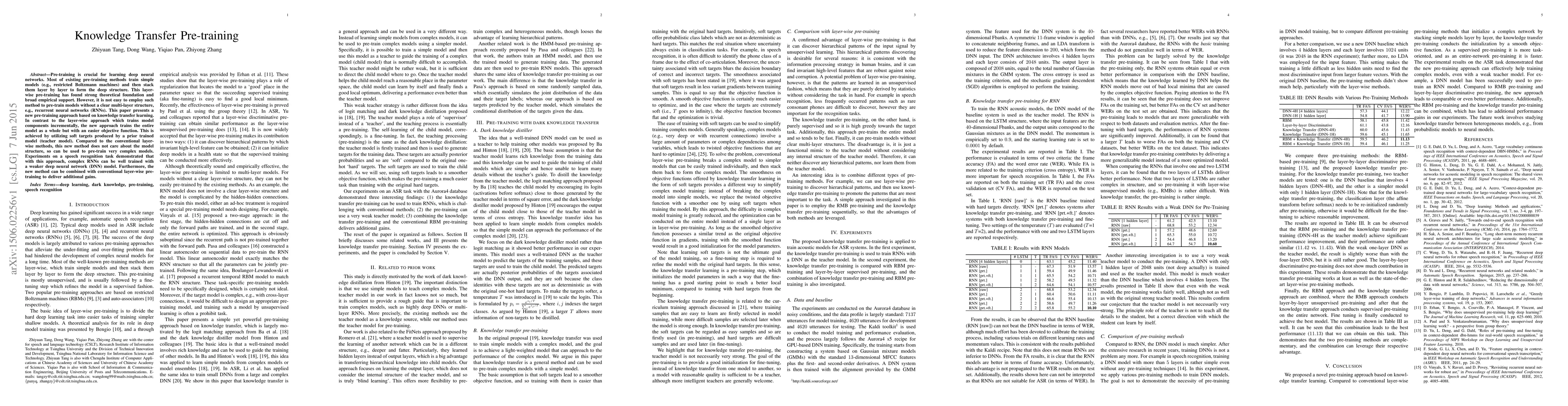This paper introduces a novel pre-training method based on knowledge transfer learning to pre-train complex models without a clear multi-layer structure, such as RNNs. It trains the entire model as a whole using soft targets from a prior trained model, demonstrating effective training of complex RNNs with a weaker DNN.