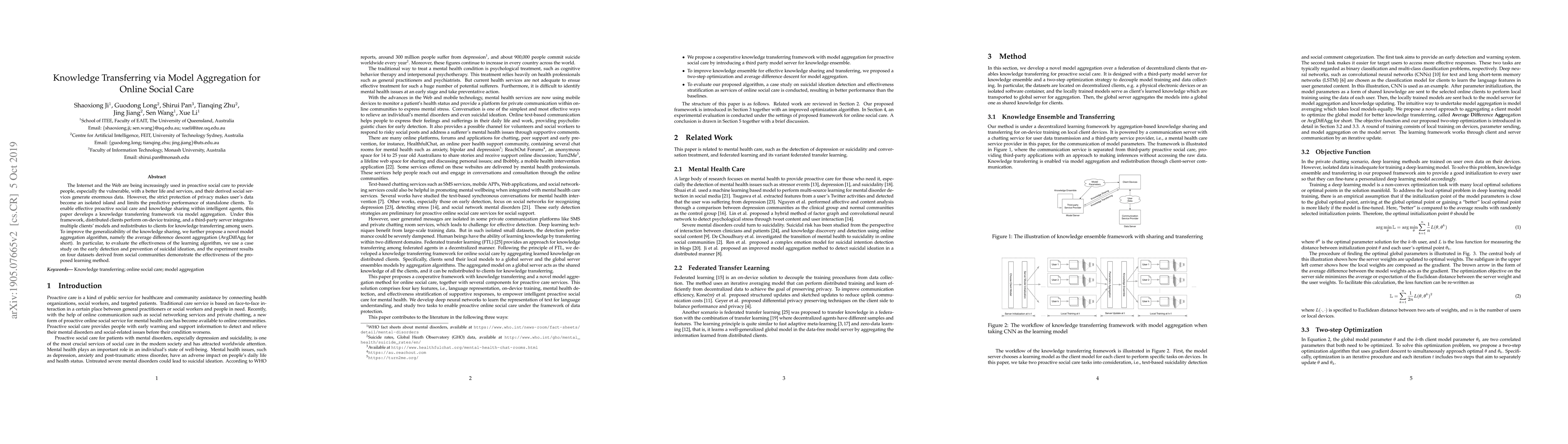 This paper proposes a knowledge transferring framework via model aggregation to enhance proactive social care, especially for vulnerable individuals. The framework uses a novel average difference descent aggregation algorithm to integrate distributed clients' models, improving generalizability without compromising privacy. Experiments on detecting suicidal ideation show the method's effectiveness.