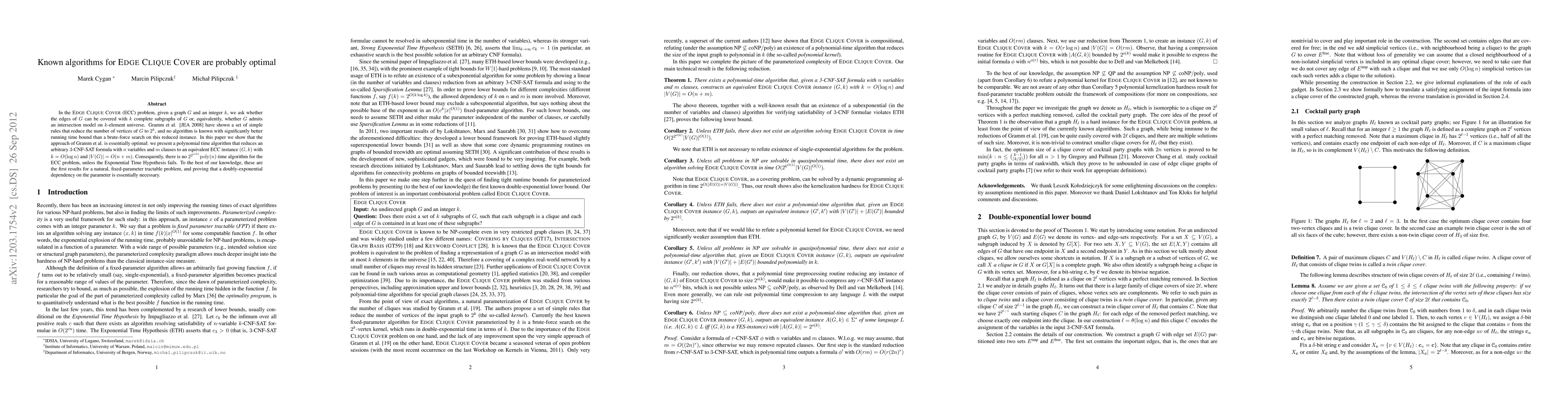 This paper demonstrates that existing algorithms for the EDGE CLIQUE COVER (ECC) problem, which involve reducing graph vertices to 2^k, are likely optimal. The authors present a novel method to transform any 3-CNF-SAT formula into an ECC instance with a vertex count of O(n + m) and k = O(log n), proving no significantly better algorithm exists for ECC than brute force, under the Exponential Time Hypothesis. This work is significant for establishing lower bounds on algorithmic complexity for a fixed-parameter tractable problem.