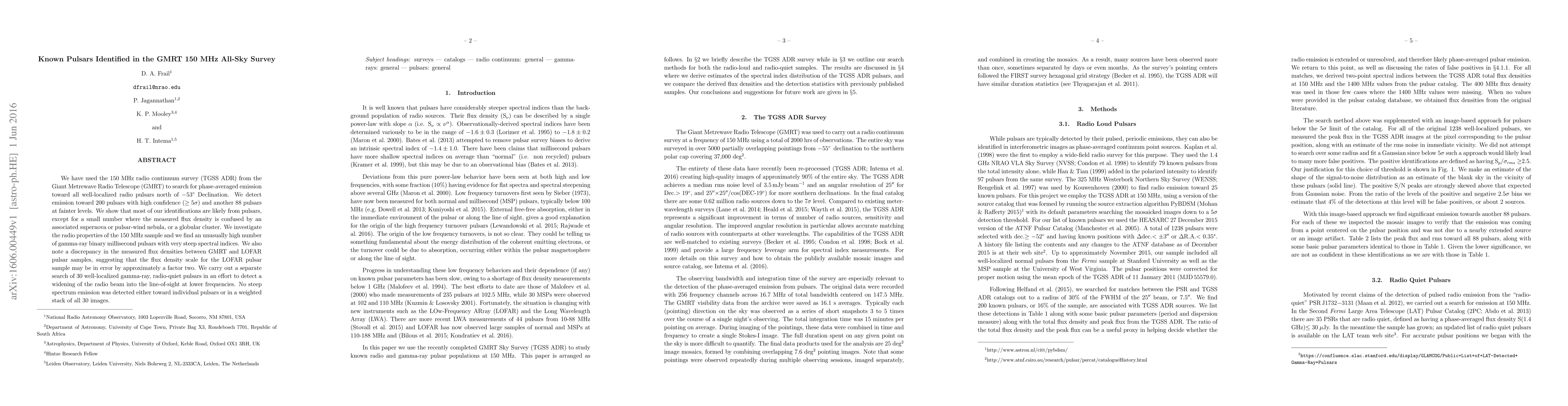 We have used the 150 MHz radio continuum survey (TGSS ADR) from the Giant Metrewave Radio Telescope (GMRT) to search for phase-averaged emission toward all well-localized radio pulsars north of -53deg Declination. We detect emission toward 200 pulsars with high confidence (>=5-sigma) and another 88 pulsars at fainter levels. We show that most of our identifications are likely from pulsars, except for a small number where the measured flux density is confused by an associated supernova or pulsar-wind nebula, or a globular cluster. We investigate the radio properties of the 150 MHz sample and we find an unusually high number of gamma-ray binary millisecond pulsars with very steep spectral indices. We also note a discrepancy in the measured flux densities between GMRT and LOFAR pulsar samples, suggesting that the flux density scale for the LOFAR pulsar sample may be in error by approximately a factor two. We carry out a separate search of 30 well-localized gamma-ray, radio-quiet pulsars in an effort to detect a widening of the radio beam into the line-of-sight at lower frequencies. No steep spectrum emission was detected either toward individual pulsars or in a weighted stack of all 30 images.