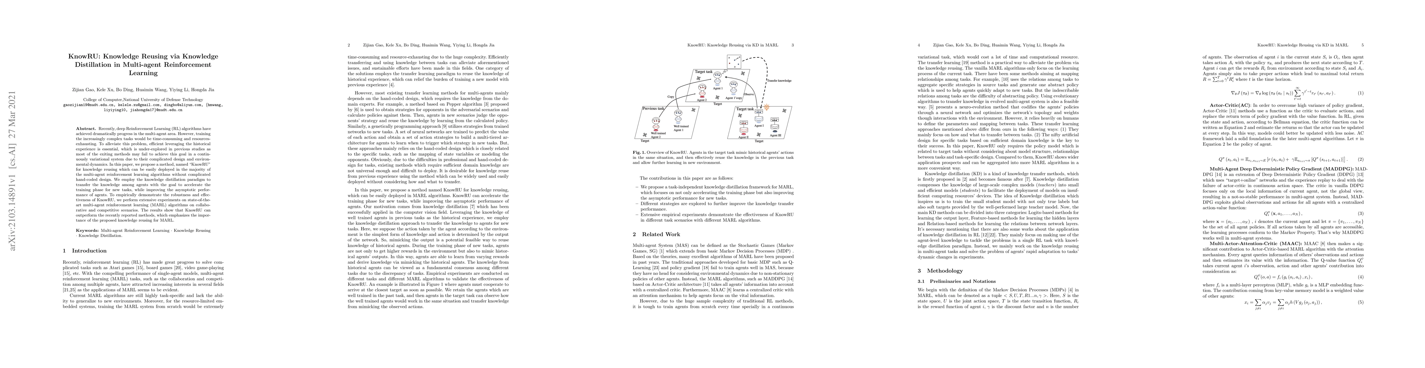 KnowRU proposes a knowledge distillation method for reusing historical experience in multi-agent reinforcement learning to accelerate training and improve performance. Extensive experiments demonstrate its effectiveness over existing methods in both collaborative and competitive scenarios.