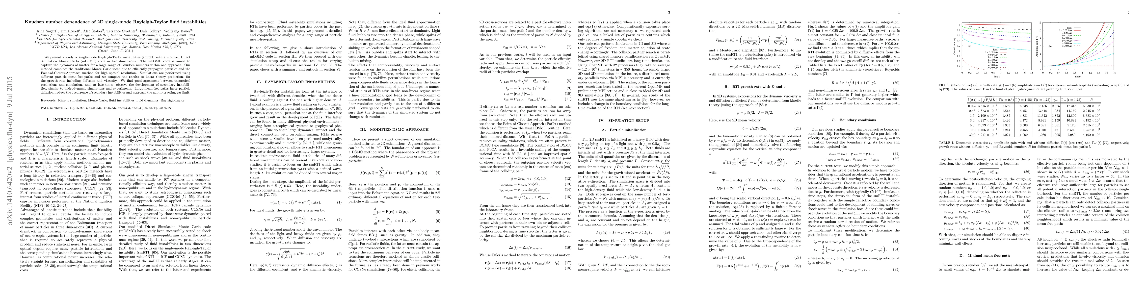 We present a study of single-mode Rayleigh-Taylor instabilities (smRTI) with a modified Direct Simulation Monte Carlo (mDSMC) code in two dimensions. The mDSMC code is aimed to capture the dynamics of matter for a large range of Knudsen numbers within one approach. Our method combines the traditional Monte Carlo technique to efficiently propagate particles and the Point-of-Closest-Approach method for high spatial resolution. Simulations are performed using different particle mean-free-paths and we compare the results to linear theory predictions for the growth rate including diffusion and viscosity. We find good agreement between theoretical predictions and simulations and, at late times, observe the development of secondary instabilities, similar to hydrodynamic simulations and experiments. Large mean-free-paths favor particle diffusion, reduce the occurrence of secondary instabilities and approach the non-interacting gas limit.