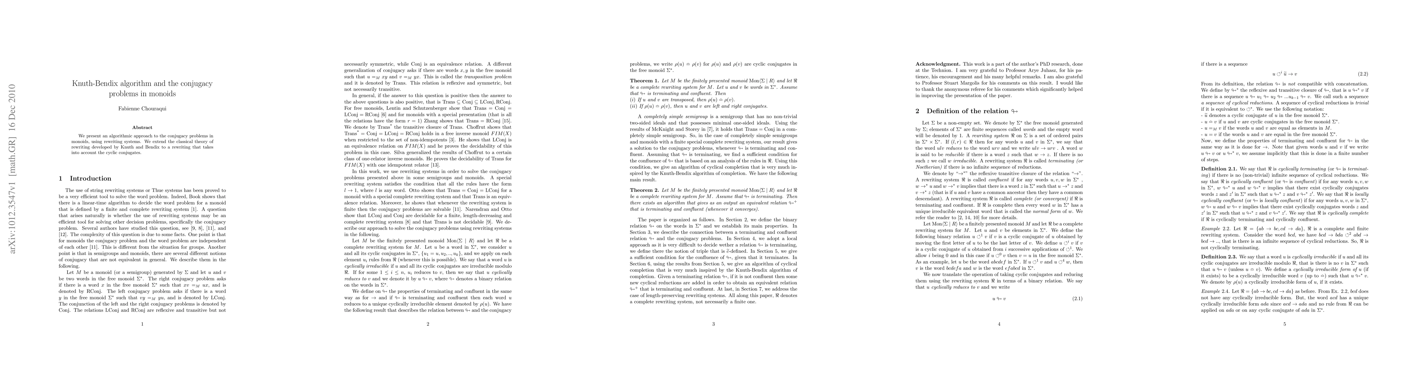 This paper proposes an algorithmic method for solving conjugacy problems in monoids using extended Knuth-Bendix rewriting systems that incorporate cyclic conjugates. The approach leverages classical rewriting theory to address these complex algebraic structures.
