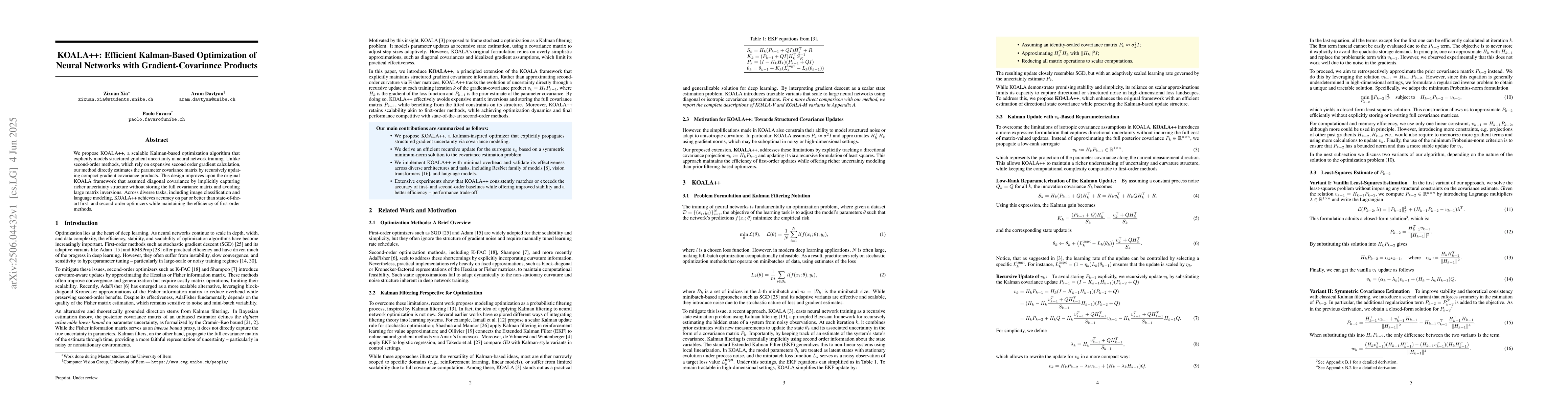 The research introduces KOALA++, an efficient Kalman-based optimization algorithm for neural networks that models structured gradient uncertainty by recursively updating compact gradient covariance products, avoiding expensive second-order gradient calculations and large matrix inversions.