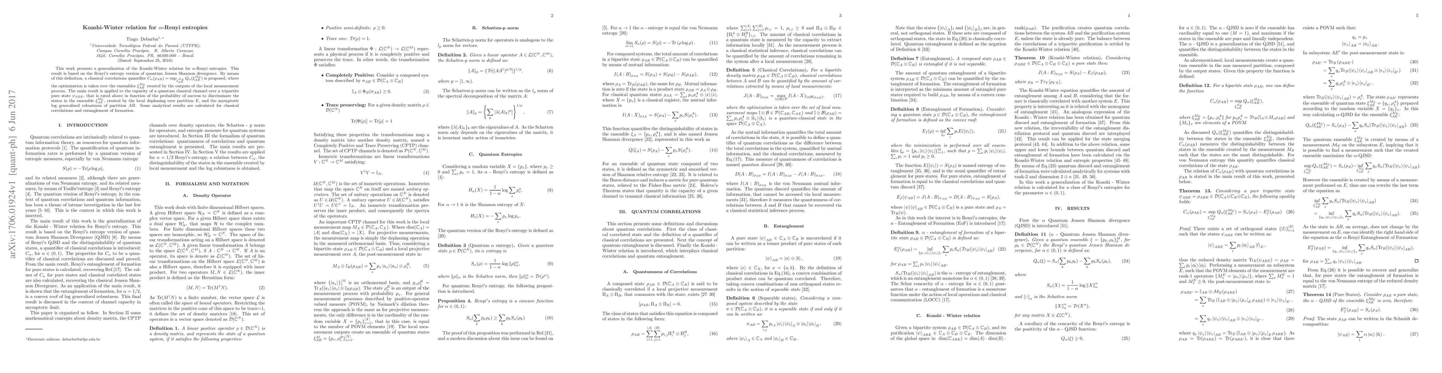 This work presents a generalization of the Koashi-Winter relation for $\alpha$-Renyi entropies. This result is based on the Renyi\apos s entropy version of quantum Jensen Shannon divergence. By means of this definition, a classical correlations quantifier $C_{\alpha}(\rho_{AB}) = \sup_{\xi_{AB}^{M_B}} Q_{\alpha}(\xi_{AB}^{M_B})$ is proposed, where the optimization is taken over the ensembles $\xi_{AB}^{M_B}$ created by the outputs of the local measurement process. The main result is applied to the capacity of a quantum classical channel over a tripartite pure state $\psi_{ABE}$, that is rated above in function of the probability of success to discriminate the states in the ensemble $\xi_{AE}^{M_E}$, created by the local dephasing over partition $E$, and the asymptotic log generalized robustness of partition $AB$. Some analytical results are calculated for classical correlations and entanglement of formation.