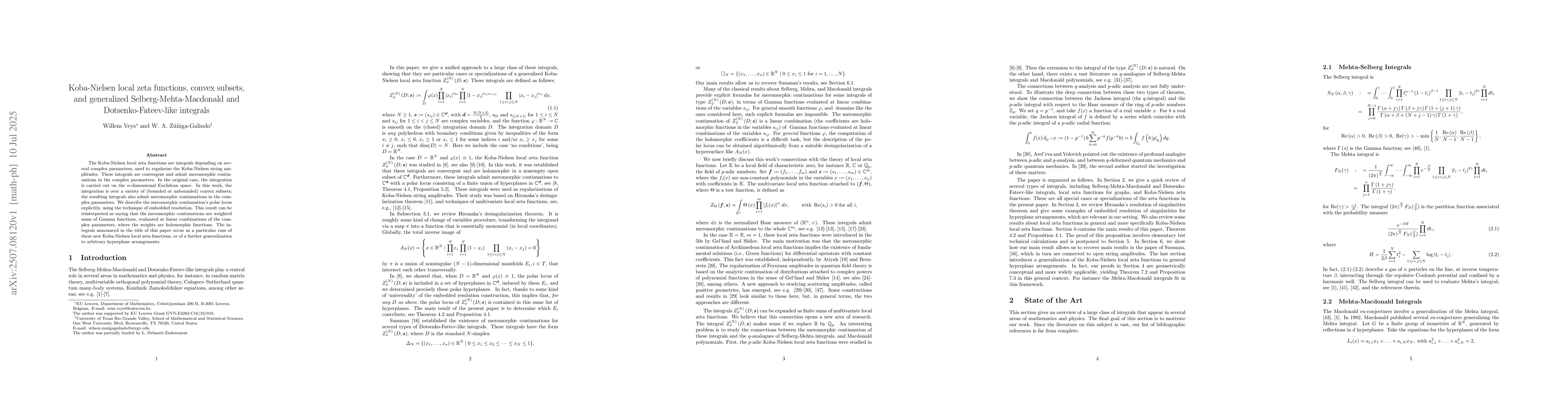 The Koba-Nielsen local zeta functions are integrals depending on several complex parameters, used to regularize the Koba-Nielsen string amplitudes. These integrals are convergent and admit meromorphic continuations in the complex parameters. In the original case, the integration is carried out on the n-dimensional Euclidean space. In this work, the integration is over a variety of (bounded or unbounded) convex subsets; the resulting integrals also admit meromorphic continuations in the complex parameters. We describe the meromorphic continuation's polar locus explicitly, using the technique of embedded resolution. This result can be reinterpreted as saying that the meromorphic continuations are weighted sums of Gamma functions, evaluated at linear combinations of the complex parameters, where the weights are holomorphic functions. The integrals announced in the title of this paper occur as a particular case of these new Koba-Nielsen local zeta functions, or of a further generalization to arbitrary hyperplane arrangements.