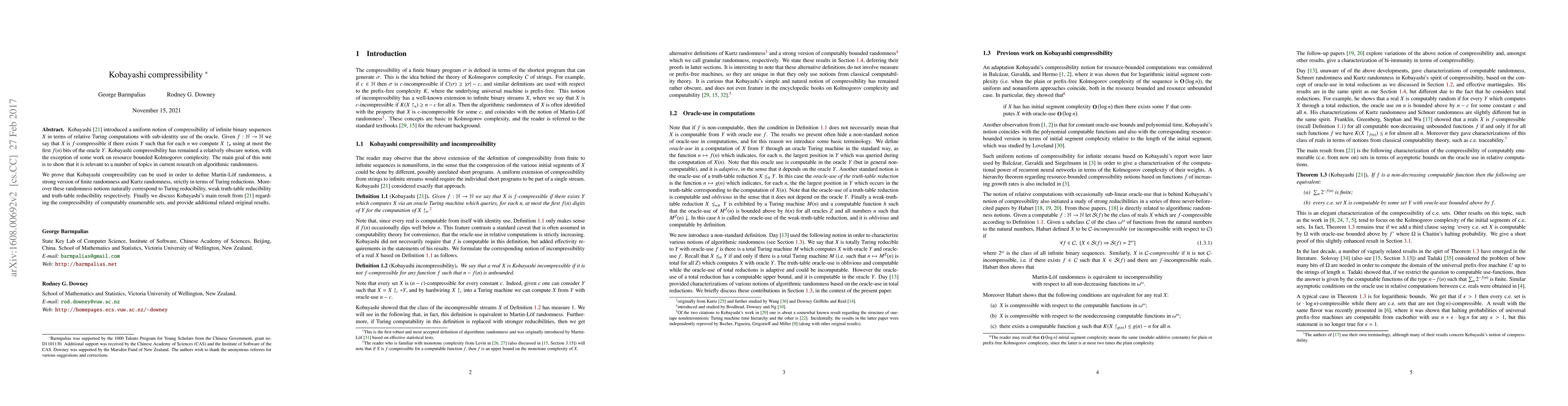 Kobayashi introduced a uniform notion of compressibility of infinite binary sequences in terms of relative Turing computations with sub-identity use of the oracle. Kobayashi compressibility has remained a relatively obscure notion, with the exception of some work on resource bounded Kolmogorov complexity. The main goal of this note is to show that it is relevant to a number of topics in current research on algorithmic randomness. We prove that Kobayashi compressibility can be used in order to define Martin-Loef randomness, a strong version of finite randomness and Kurtz randomness, strictly in terms of Turing reductions. Moreover these randomness notions naturally correspond to Turing reducibility, weak truth-table reducibility and truth-table reducibility respectively. Finally we discuss Kobayashi's main result from his 1981 technical report regarding the compressibility of computably enumerable sets, and provide additional related original results.