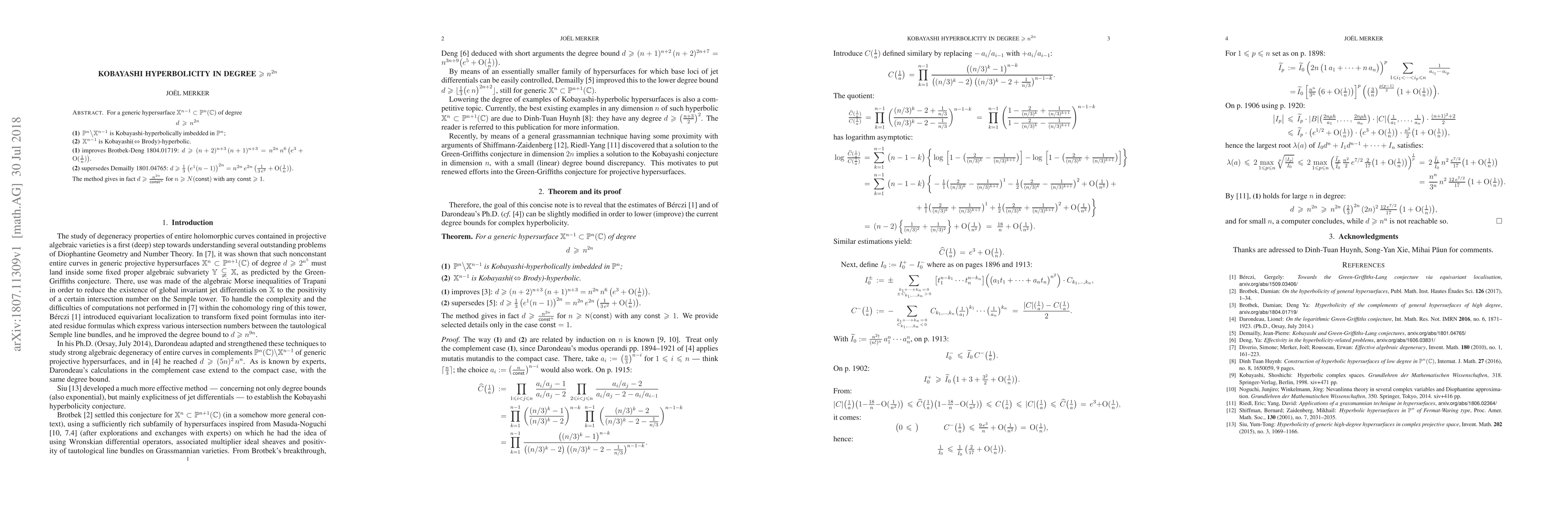 For a generic hypersurface $\mathbb{X}^{n-1} \subset \mathbb{P}^n(\mathbb{C})$ of degree \[ d \,\geqslant\, n^{2n} \] (1) $\mathbb{P}^n \big\backslash \mathbb{X}^{n-1}$ is Kobayashi-hyperbolically imbedded in $\mathbb{P}^n$; (2) $\mathbb{X}^{n-1}$ is Kobayashi($\Leftrightarrow$ Brody)-hyperbolic. (1) improves Brotbek-Deng 1804.01719: $d \geqslant (n+2)^{n+3}\, (n+1)^{n+3} = n^{2n}\,n^6\, \big(e^3+{\rm O}(\frac{1}{n}) \big)$. (2) supersedes Demailly 1801.04765: $d \geqslant \frac{1}{3}\, \big( e^1(n-1) \big)^{2n} = n^{2n}\, e^{2n}\, \big( \frac{1}{3\, e^2} + {\rm O} (\frac{1}{n}) \big)$. The method gives in fact $d \geqslant \frac{n^{2n}}{{\sf const}^n}$ for $n \geqslant N({\sf const})$ with any ${\sf const} > 1$.