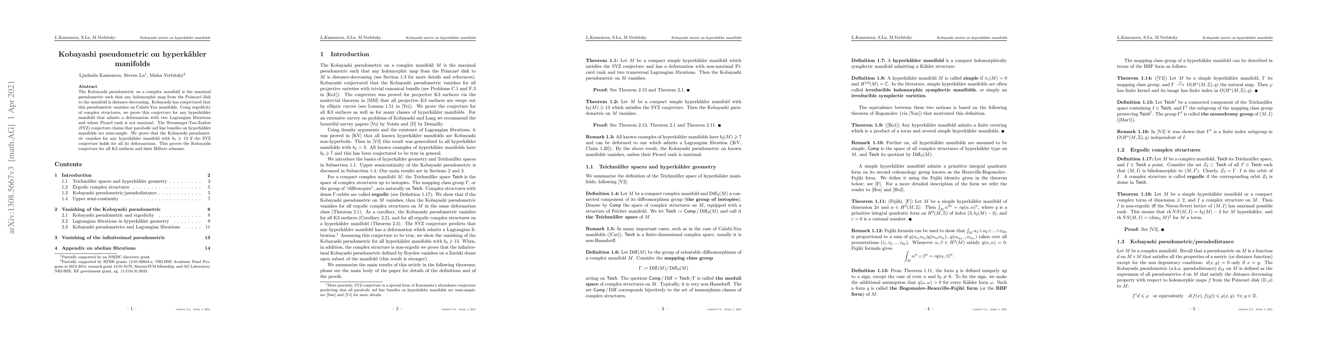 The Kobayashi pseudometric on a complex manifold is the maximal pseudometric such that any holomorphic map from the Poincar\'e disk to the manifold is distance-decreasing. Kobayashi has conjectured that this pseudometric vanishes on Calabi-Yau manifolds. Using ergodicity of complex structures, we prove this conjecture for any hyperk\"ahler manifold that admits a deformation with two Lagrangian fibrations and whose Picard rank is not maximal. The Strominger-Yau-Zaslow (SYZ) conjecture claims that parabolic nef line bundles on hyperk\"ahler manifolds are semi-ample. We prove that the Kobayashi pseudometric vanishes for any hyperk\"ahler manifold with $b_2\geq 13$ if the SYZ conjecture holds for all its deformations. This proves the Kobayashi conjecture for all K3 surfaces and their Hilbert schemes.