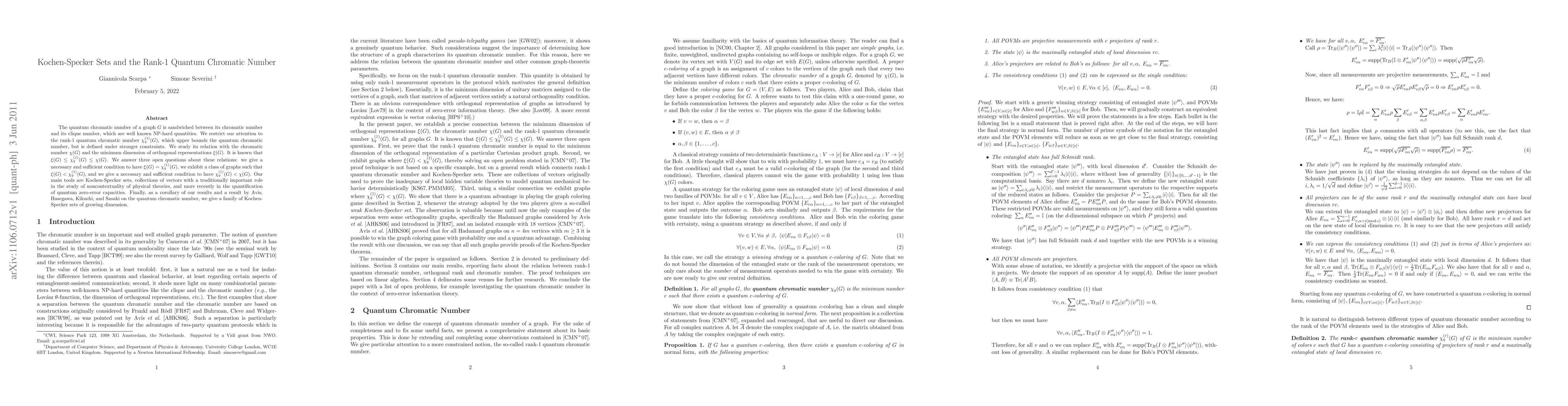 The quantum chromatic number of a graph $G$ is sandwiched between its chromatic number and its clique number, which are well known NP-hard quantities. We restrict our attention to the rank-1 quantum chromatic number $\chi_q^{(1)}(G)$, which upper bounds the quantum chromatic number, but is defined under stronger constraints. We study its relation with the chromatic number $\chi(G)$ and the minimum dimension of orthogonal representations $\xi(G)$. It is known that $\xi(G) \leq \chi_q^{(1)}(G) \leq \chi(G)$. We answer three open questions about these relations: we give a necessary and sufficient condition to have $\xi(G) = \chi_q^{(1)}(G)$, we exhibit a class of graphs such that $\xi(G) < \chi_q^{(1)}(G)$, and we give a necessary and sufficient condition to have $\chi_q^{(1)}(G) < \chi(G)$. Our main tools are Kochen-Specker sets, collections of vectors with a traditionally important role in the study of noncontextuality of physical theories, and more recently in the quantification of quantum zero-error capacities. Finally, as a corollary of our results and a result by Avis, Hasegawa, Kikuchi, and Sasaki on the quantum chromatic number, we give a family of Kochen-Specker sets of growing dimension.