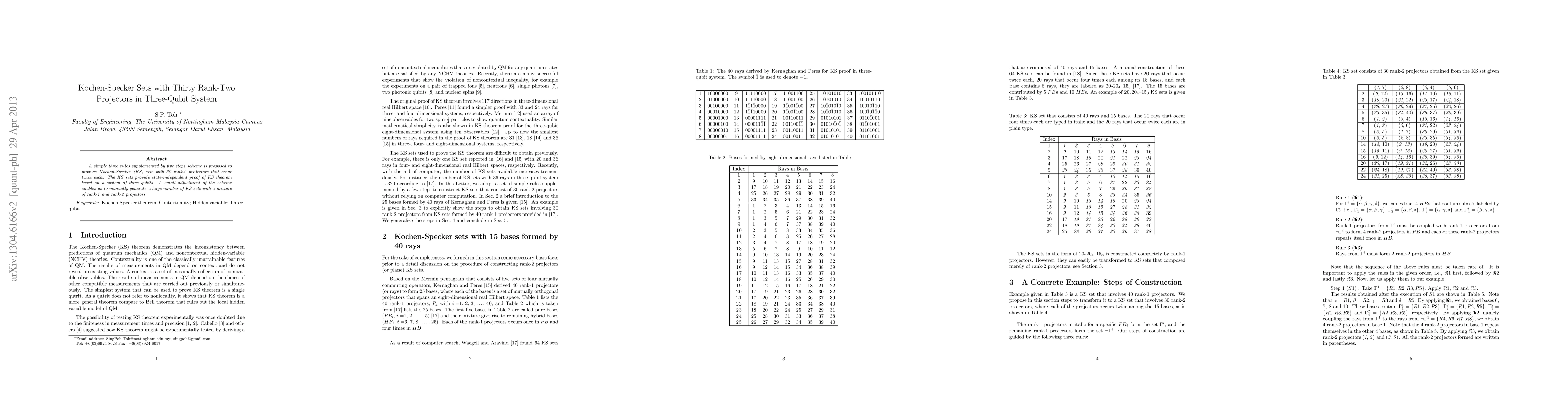 A simple three rules supplemented by five steps scheme is proposed to produce Kochen-Specker (KS) sets with 30 rank-2 projectors that occur twice each. The KS sets provide state-independent proof of KS theorem based on a system of three qubits. A small adjustment of the scheme enables us to manually generate a large number of KS sets with a mixture of rank-1 and rank-2 projectors.