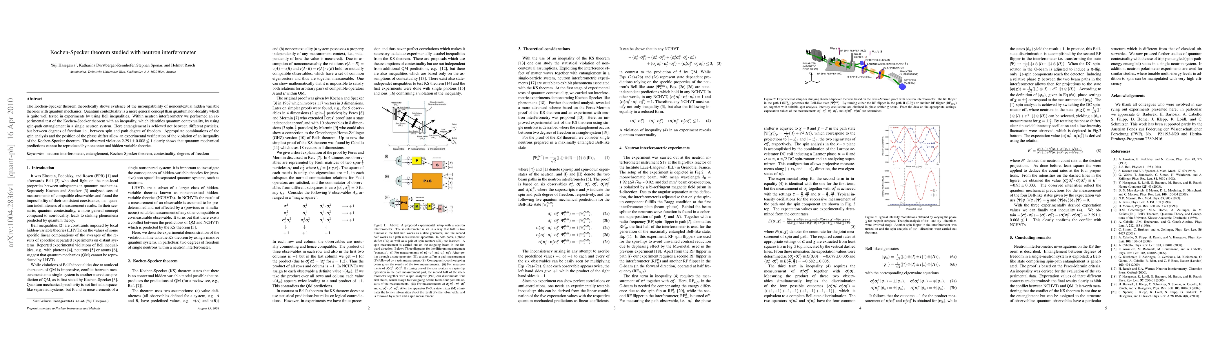 This paper experimentally tests the Kochen-Specker theorem using neutron interferometry, demonstrating quantum contextuality through spin-path entanglement. The observed value above 1 confirms the incompatibility of noncontextual hidden variable theories with quantum mechanics.