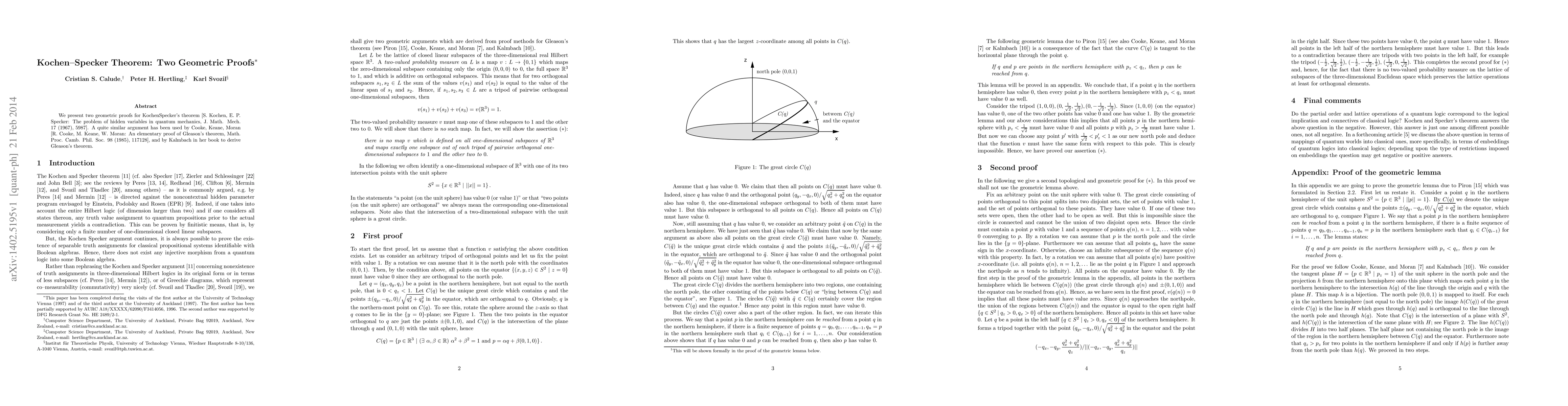 The paper presents two geometric proofs for the Kochen-Specker theorem, utilizing a similar argument as Cooke, Keane, and Moran, and Kalmbach's work on deriving the Gleason theorem.