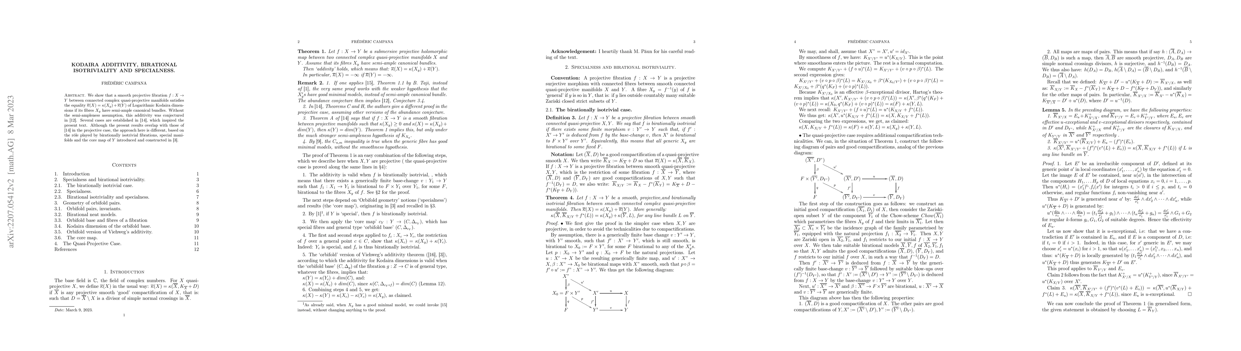 We show, using [14], that a smooth projective fibration f : X $\rightarrow$ Y between connected complex quasi-projective manifolds satisfies the equality $\kappa$(X) = $\kappa$(X y) + $\kappa$(Y) of Logarithmic Kodaira dimensions if its fibres X y admit a good minimal model. Without the last assumption, this was conjectured in [11]. Several cases are established in [13], which inspired the present text. Although the present results overlap with those of [13] in the projective case, the approach here is different, based on the r{\^o}le played by birationally isotrivial fibrations, special manifolds and the core map of Y introduced and constructed in [3].