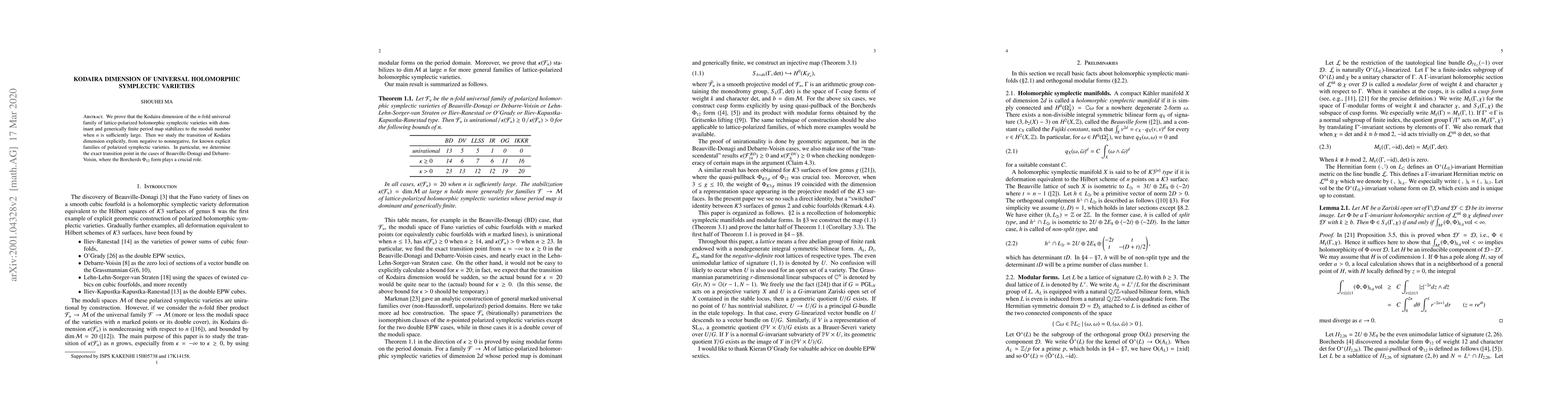 We prove that the Kodaira dimension of the n-fold universal family of lattice-polarized holomorphic symplectic varieties with dominant and generically finite period map stabilizes to the moduli number when n is sufficiently large. Then we study the transition of Kodaira dimension explicitly, from negative to nonnegative, for known explicit families of polarized symplectic varieties. In particular, we determine the exact transition point in the cases of Beauville-Donagi and Debarre-Voisin, where the Borcherds Phi_{12} form plays a crucial role.