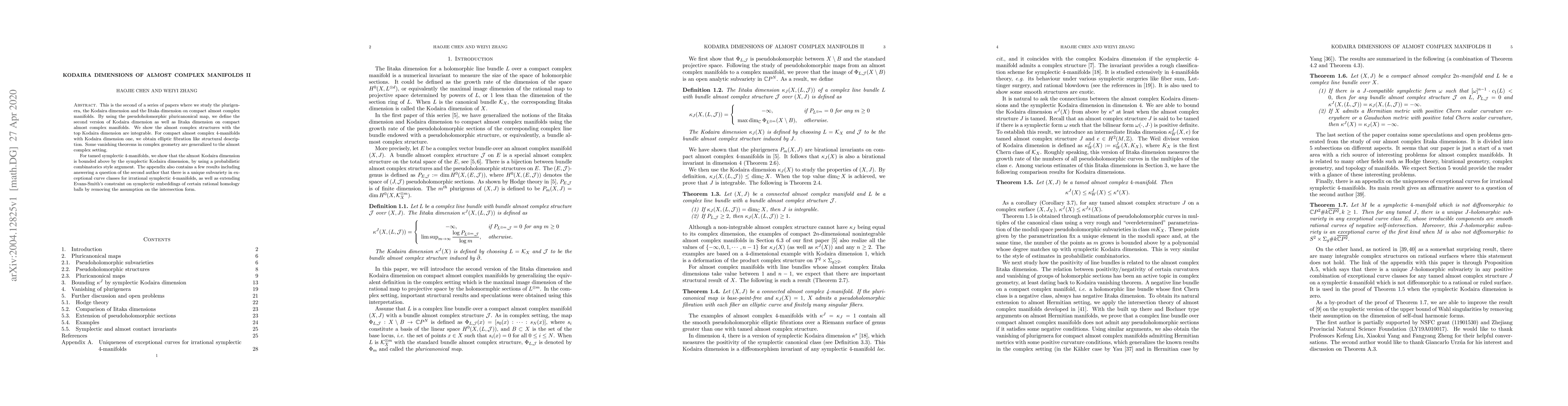This paper explores the Kodaira dimension and plurigenera on compact almost complex manifolds, introducing a refined definition of these dimensions via pseudoholomorphic pluricanonical maps. It proves that almost complex structures achieving the highest Kodaira dimension are integrable and provides structural insights for 4-manifolds with Kodaira dimension one, along with generalizations of vanishing theorems to the almost complex setting.