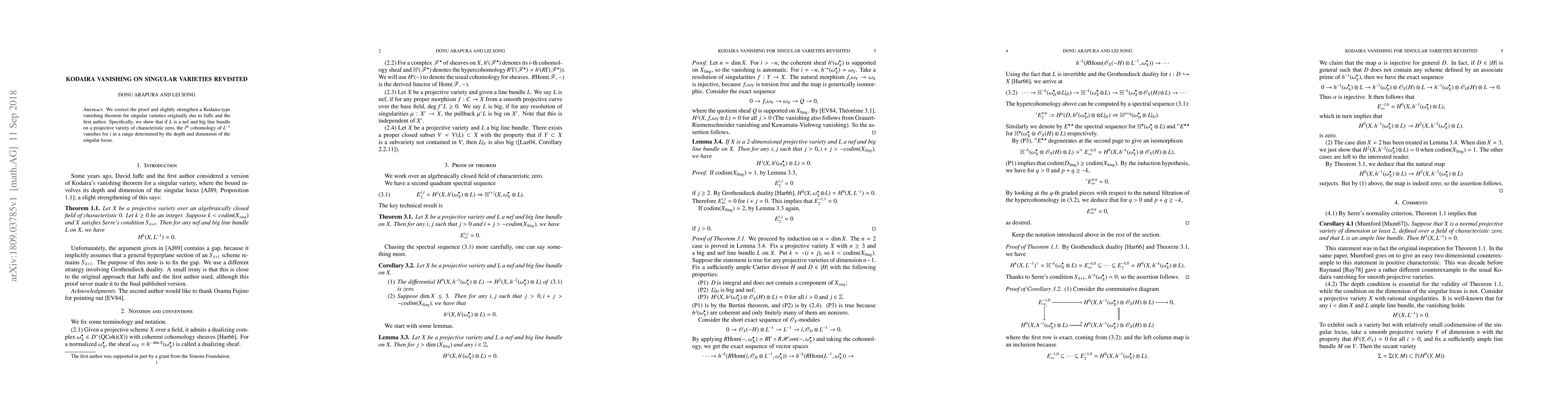 This paper corrects and strengthens a Kodaira-type vanishing theorem for singular varieties, showing that for a nef and big line bundle on a projective variety of characteristic zero, the $i^{\text{th}}$ cohomology of its inverse vanishes for $i$ in a range determined by the depth and dimension of the singular locus.