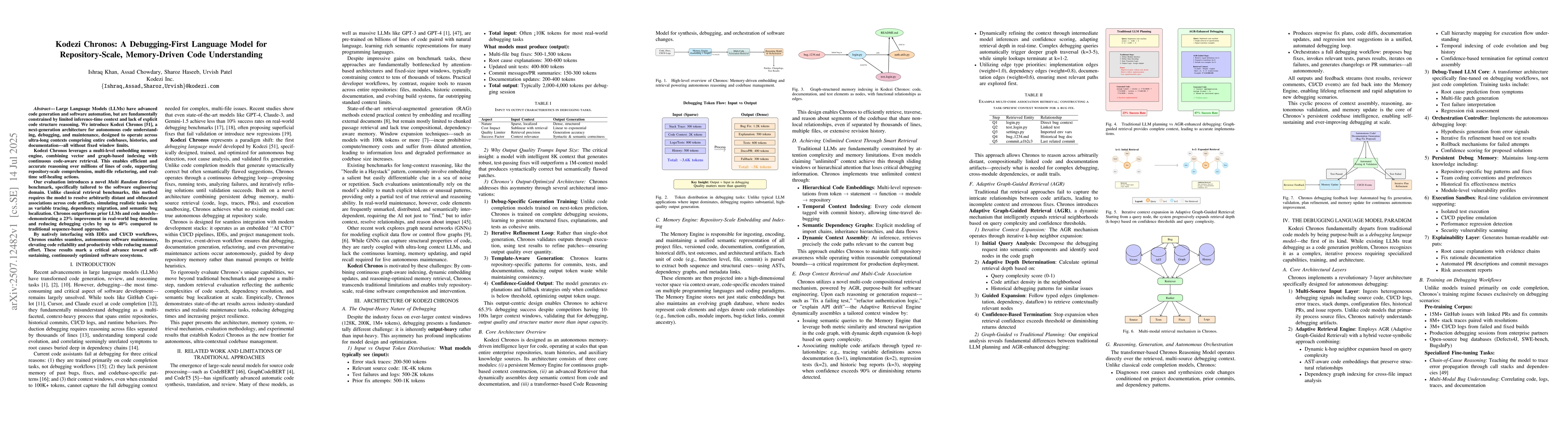 Kodezi Chronos introduces a novel debugging-first language model architecture, incorporating a multi-level embedding memory engine that combines vector and graph-based indexing with continuous code-aware retrieval for efficient and accurate reasoning over millions of lines of code.