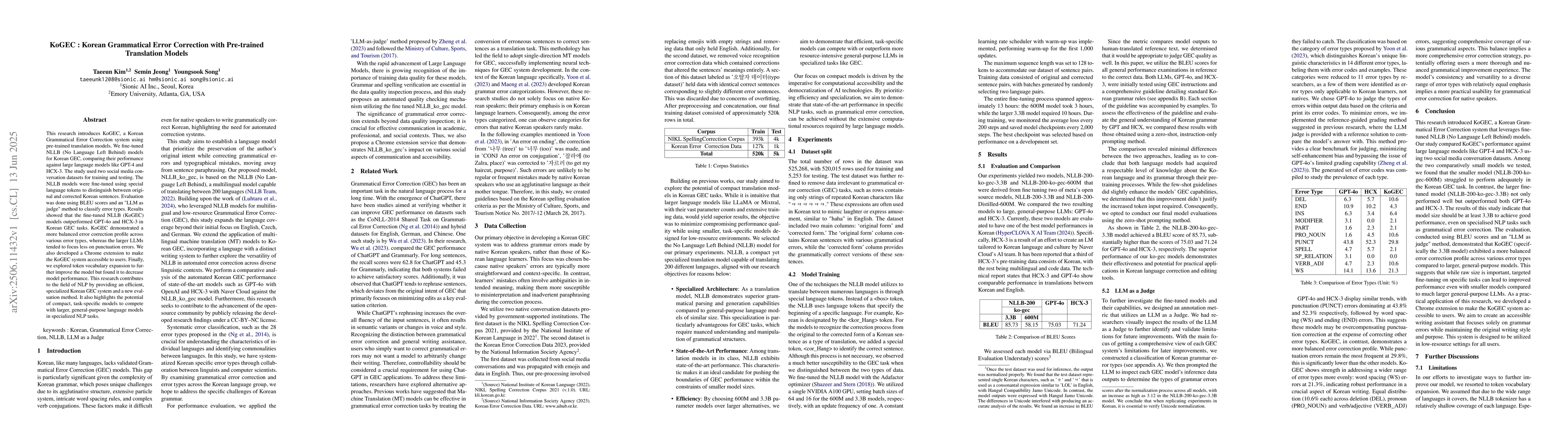 This research introduces KoGEC, a Korean Grammatical Error Correction system using pre\--trained translation models. We fine-tuned NLLB (No Language Left Behind) models for Korean GEC, comparing their performance against large language models like GPT-4 and HCX-3. The study used two social media conversation datasets for training and testing. The NLLB models were fine-tuned using special language tokens to distinguish between original and corrected Korean sentences. Evaluation was done using BLEU scores and an "LLM as judge" method to classify error types. Results showed that the fine-tuned NLLB (KoGEC) models outperformed GPT-4o and HCX-3 in Korean GEC tasks. KoGEC demonstrated a more balanced error correction profile across various error types, whereas the larger LLMs tended to focus less on punctuation errors. We also developed a Chrome extension to make the KoGEC system accessible to users. Finally, we explored token vocabulary expansion to further improve the model but found it to decrease model performance. This research contributes to the field of NLP by providing an efficient, specialized Korean GEC system and a new evaluation method. It also highlights the potential of compact, task-specific models to compete with larger, general-purpose language models in specialized NLP tasks.