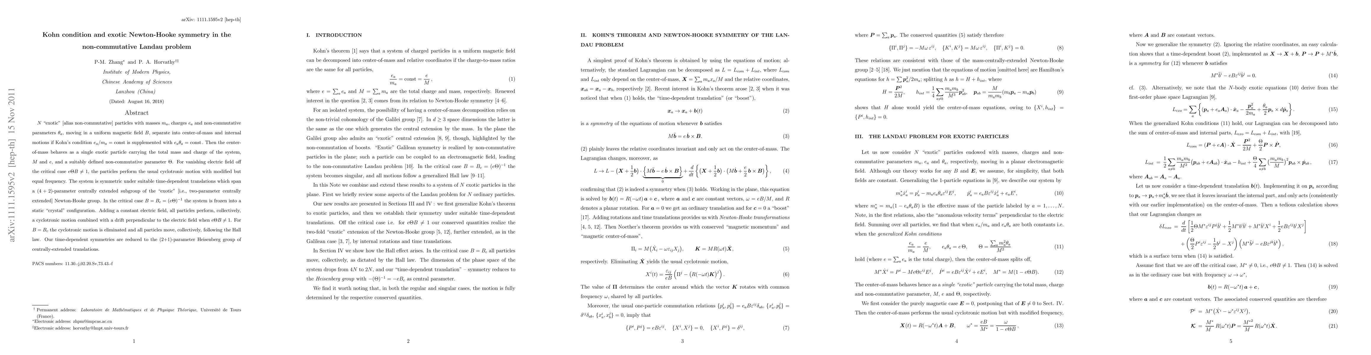 $N$ "exotic" [alias non-commutative] particles with masses $m_a$, charges $e_a$ and non-commutative parameters $\theta_a$, moving in a uniform magnetic field $B$, separate into center-of-mass and internal motions if Kohn's condition $e_a/m_a=\const$ is supplemented with $e_a\theta_a=\const.$ Then the center-of-mass behaves as a single exotic particle carrying the total mass and charge of the system, $M$ and $e$, and a suitably defined non-commutative parameter $\Theta$. For vanishing electric field off the critical case $e\Theta B\neq1$, the particles perform the usual cyclotronic motion with modified but equal frequency. The system is symmetric under suitable time-dependent translations which span a (4+2)- parameter centrally extended subgroup of the "exotic" [i.e., two-parameter centrally extended] Newton-Hooke group. In the critical case $B=B_c=(e\Theta)^{-1}$ the system is frozen into a static "crystal" configuration. Adding a constant electric field, all particles perform, collectively, a cyclotronic motion combined with a drift perpendicular to the electric field when $e\Theta B\neq1$. For $B=B_c$ the cyclotronic motion is eliminated and all particles move, collectively, following the Hall law. Our time-dependent symmetries are reduced to the (2+1)-parameter Heisenberg group of centrally-extended translations.