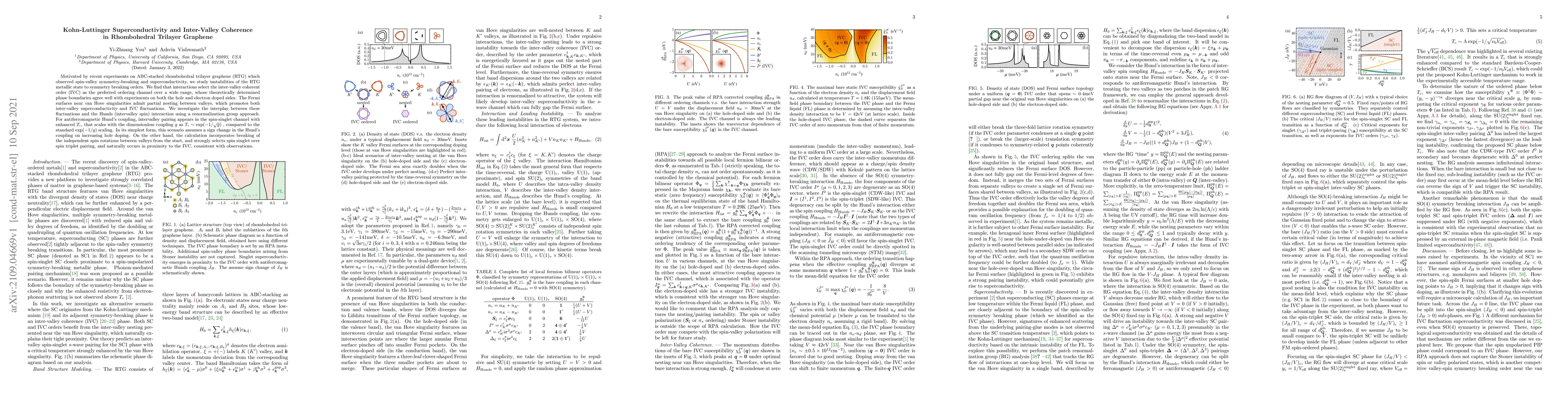 Motivated by recent experiments on ABC-stacked rhombohedral trilayer graphene (RTG) which observed spin-valley symmetry-breaking and superconductivity, we study instabilities of the RTG metallic state to symmetry breaking orders. We find that interactions select the inter-valley coherent order (IVC) as the preferred ordering channel over a wide range, whose theoretically determined phase boundaries agree well with experiments on both the hole and electron doped sides. The Fermi surfaces near van Hove singularities admit partial nesting between valleys, which promotes both inter-valley superconductivity and IVC fluctuations. We investigate the interplay between these fluctuations and the Hunds (intervalley spin) interaction using a renormalization group approach. For antiferromagnetic Hund's coupling, intervalley pairing appears in the spin-singlet channel with enhanced $T_c$, that scales with the dimensionless coupling $g$ as $T_c\sim\exp(-1/\sqrt{g})$ , compared to the standard $\exp(-1/g)$ scaling. In its simplest form, this scenario assumes a sign change in the Hund's coupling on increasing hole doping. On the other hand, the calculation incorporates breaking of the independent spin rotations between valleys from the start, and strongly selects spin singlet over spin triplet pairing, and naturally occurs in proximity to the IVC, consistent with observations.