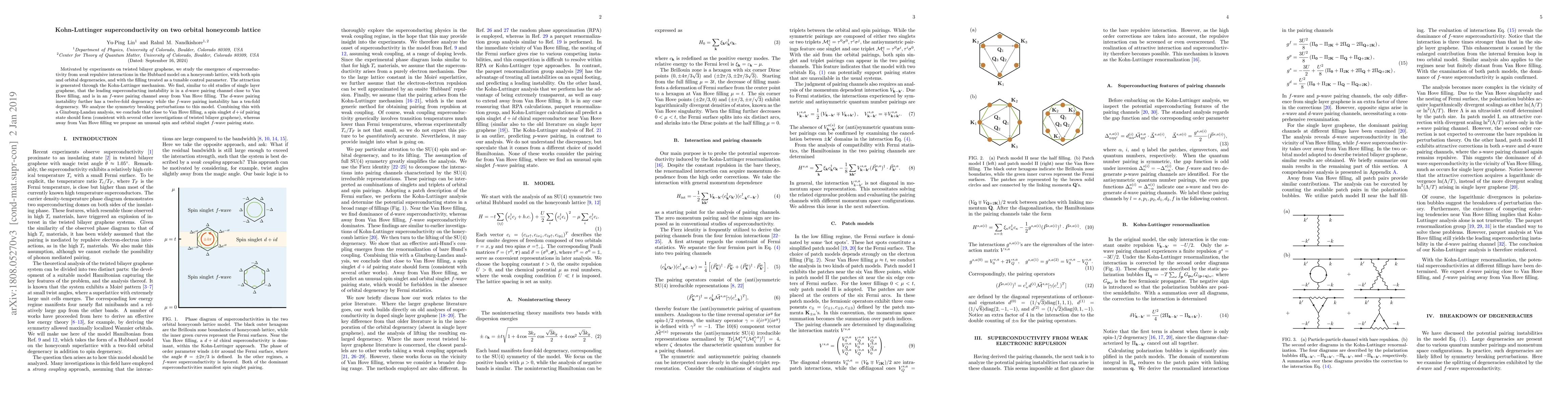 Motivated by experiments on twisted bilayer graphene, we study the emergence of superconductivity from $\textit{weak}$ repulsive interactions in the Hubbard model on a honeycomb lattice, with both spin and orbital degeneracies, and with the filling treated as a tunable control parameter. The attraction is generated through the Kohn-Luttinger mechanism. We find, similar to old studies of single layer graphene, that the leading superconducting instability is in a $d$-wave pairing channel close to Van Hove filling, and is in an $f$-wave pairing channel away from Van Hove filling. The $d$-wave pairing instability further has a twelve-fold degeneracy while the $f$-wave pairing instability has a ten-fold degeneracy. We analyze the symmetry breaking perturbations to this model. Combining this with a Ginzburg-Landau analysis, we conclude that close to Van Hove filling, a spin singlet $d+id$ pairing state should form (consistent with several other investigations of twisted bilayer graphene), whereas away from Van Hove filling we propose an unusual spin and orbital singlet $f$-wave pairing state.
