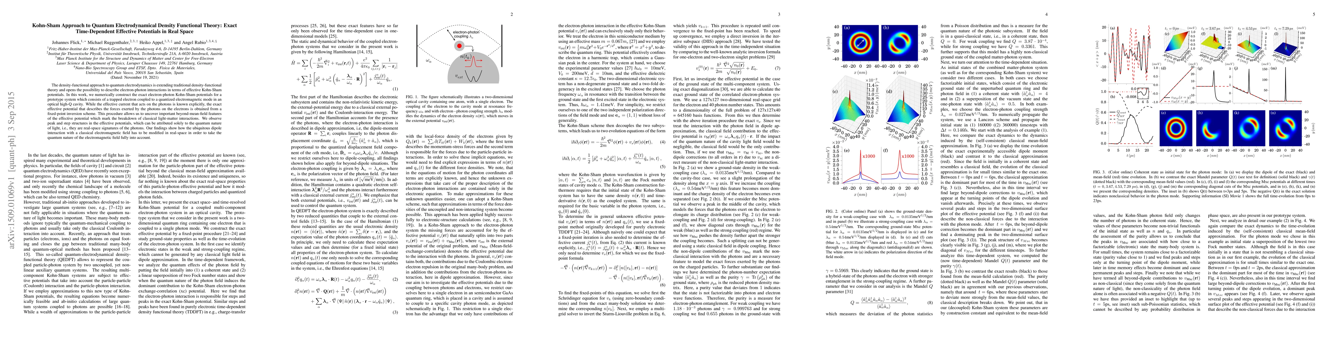 This paper explores the Kohn-Sham approach to quantum electrodynamics within density functional theory, constructing exact electron-photon potentials for a trapped electron in an optical cavity. The study reveals quantum-induced peak and step structures in the effective potentials, highlighting the need to modify classical light-matter interaction models to account for the quantum nature of electromagnetic fields.