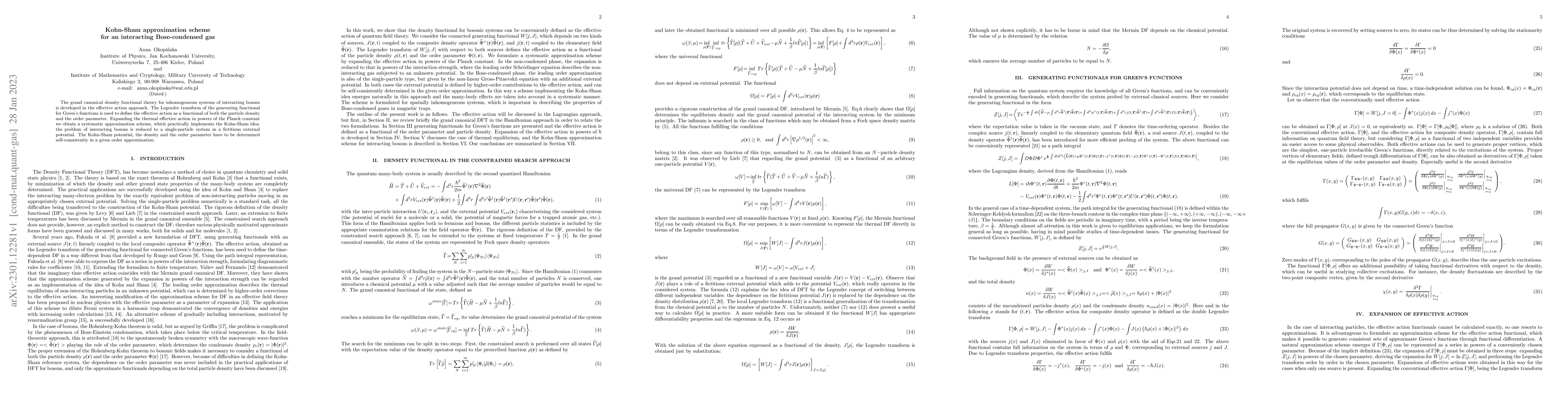 The grand canonical density functional theory for inhomogeneous systems of interacting bosons is developed in the effective action approach. The Legendre transform of the generating functional for Green's functions is used to define the effective action as a functional of both the particle density and the order parameter. Expanding the thermal effective action in powers of the Planck constant we obtain a systematic approximation scheme, which practically implements the Kohn-Sham idea: the problem of interacting bosons is reduced to a single-particle system in a fictitious external potential. The Kohn-Sham potential, the density and the order parameter have to be determined self-consistently in a given order approximation.